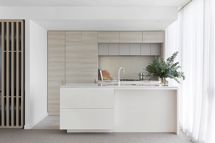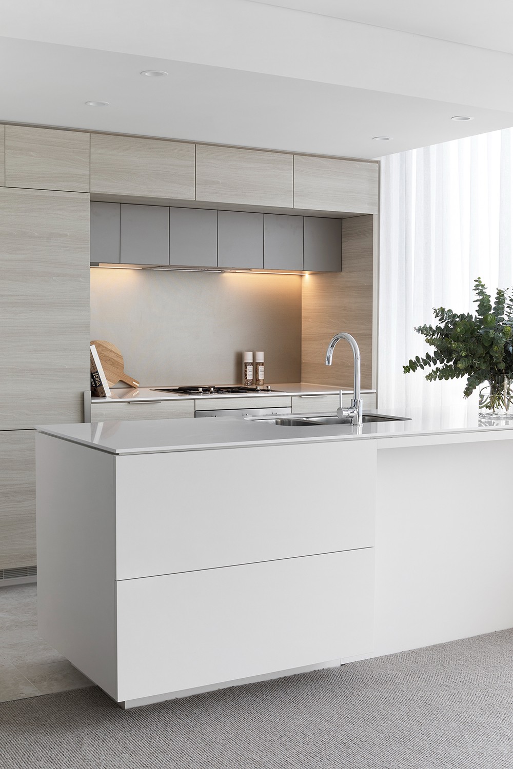Entering the apartment, one is impressed with the overall light and bright white tones. The simple and functional moving line design makes life easier and the large French windows allow more sunlight into the room to light up your mood every day. The private space inside and the bustling city outside are subtly separated yet seamlessly connected.
