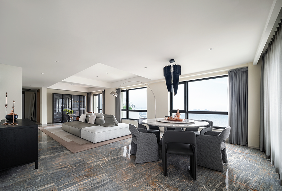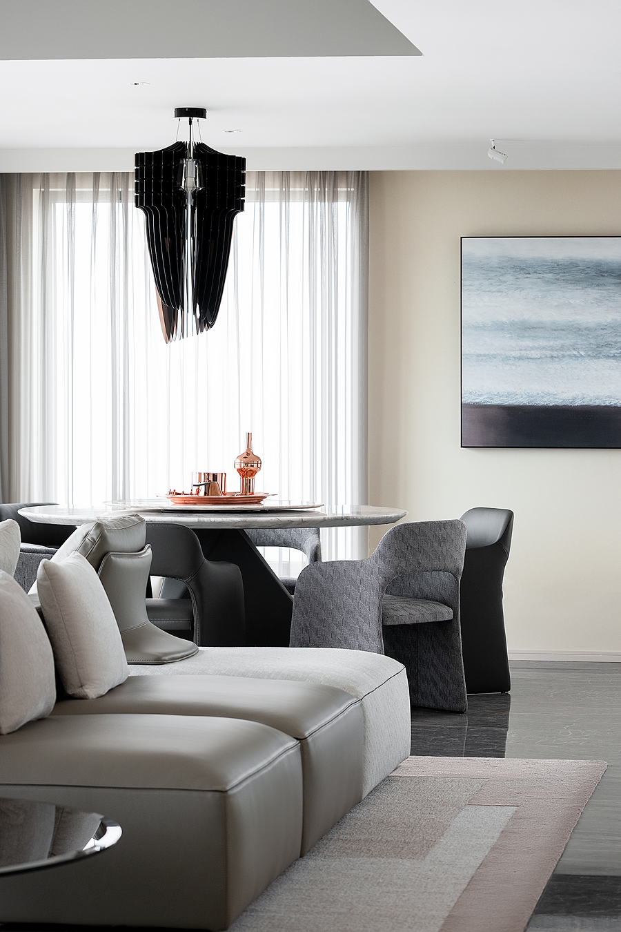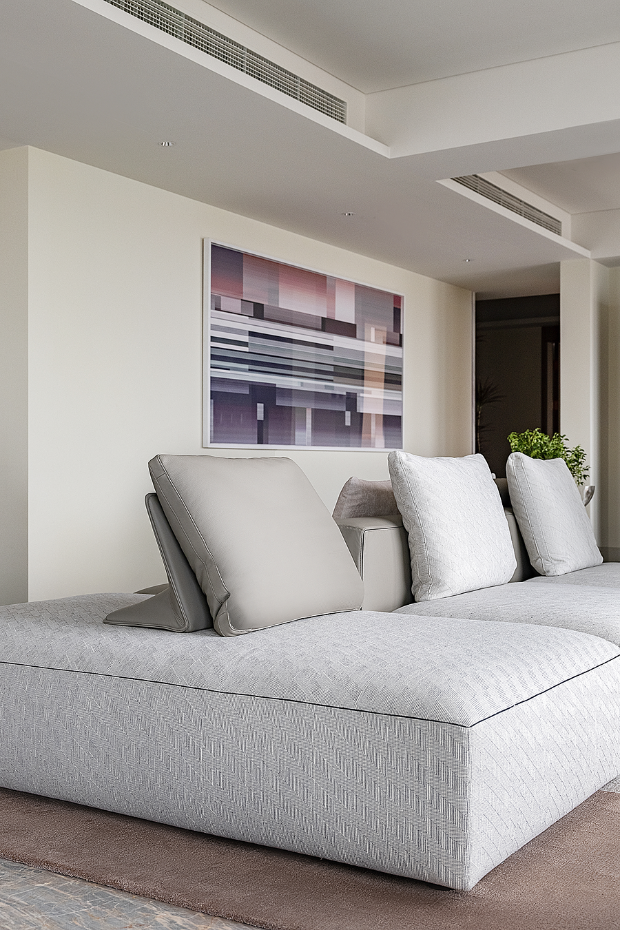 The modular RUBIX sofa in the living room offers remarkable versatility and can easily adapt to various living situations. Whether it's for everyday leisure activities or family gatherings, it serves as the ideal spot for residents to unwind and connect, feeling as if they're embraced by a vast ocean.