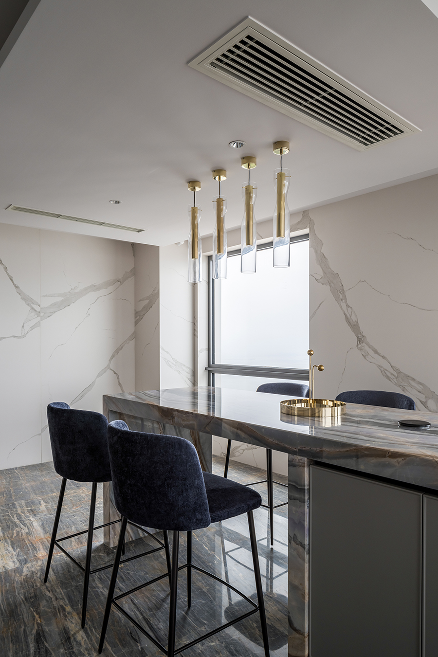 The island area embodies elegance with its understated design and stunning decor. It can also versatilely serve as a breakfast nook and an evening retreat where you can unwind and let go of the day's stresses with a glass of wine.