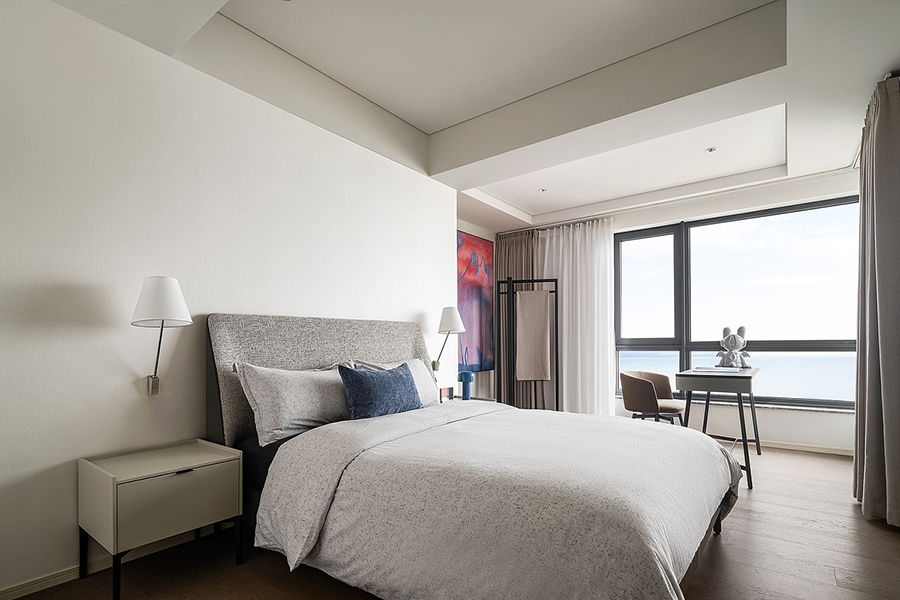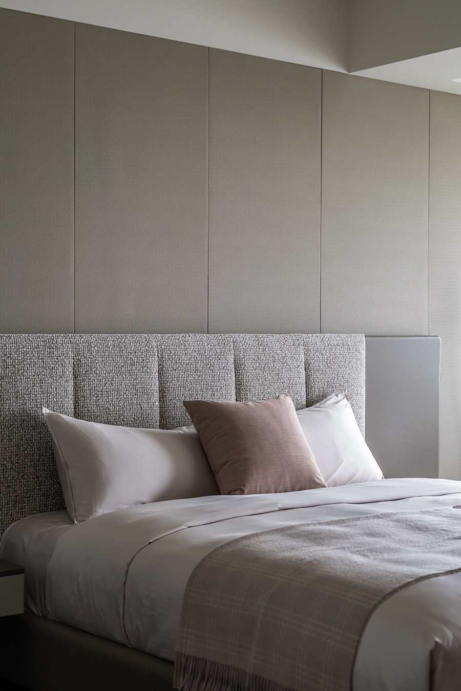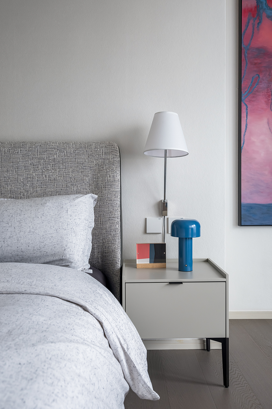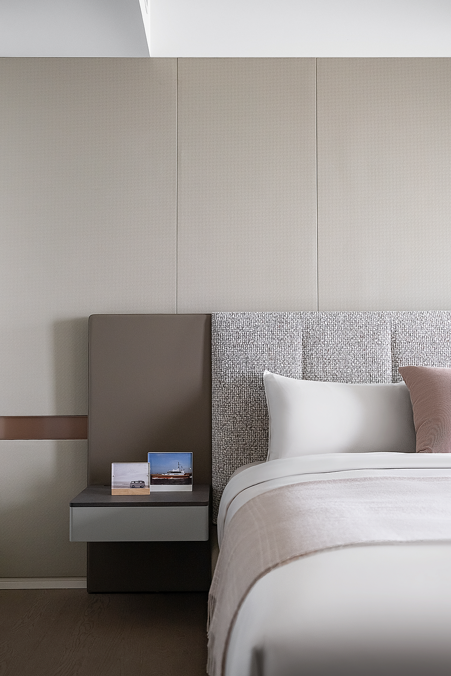 The design of the secondary bedroom emphasizes serenity and comfort, with a stress on the space's elegance and texture. This allows residents to take a quiet break from the hustle and bustle.