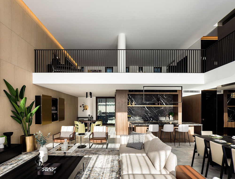 Grande共有11幢精心设计的露台别墅,每幢内部格局都不尽相同,却以微妙而优雅的建筑语言,构建出超大面积的低楼层住宅。DBI事务所副总裁 Anna Goh 称赞这个项目的“露台结构创造了惊人的体量和独特的比例,并且装饰上极具工业美感”。