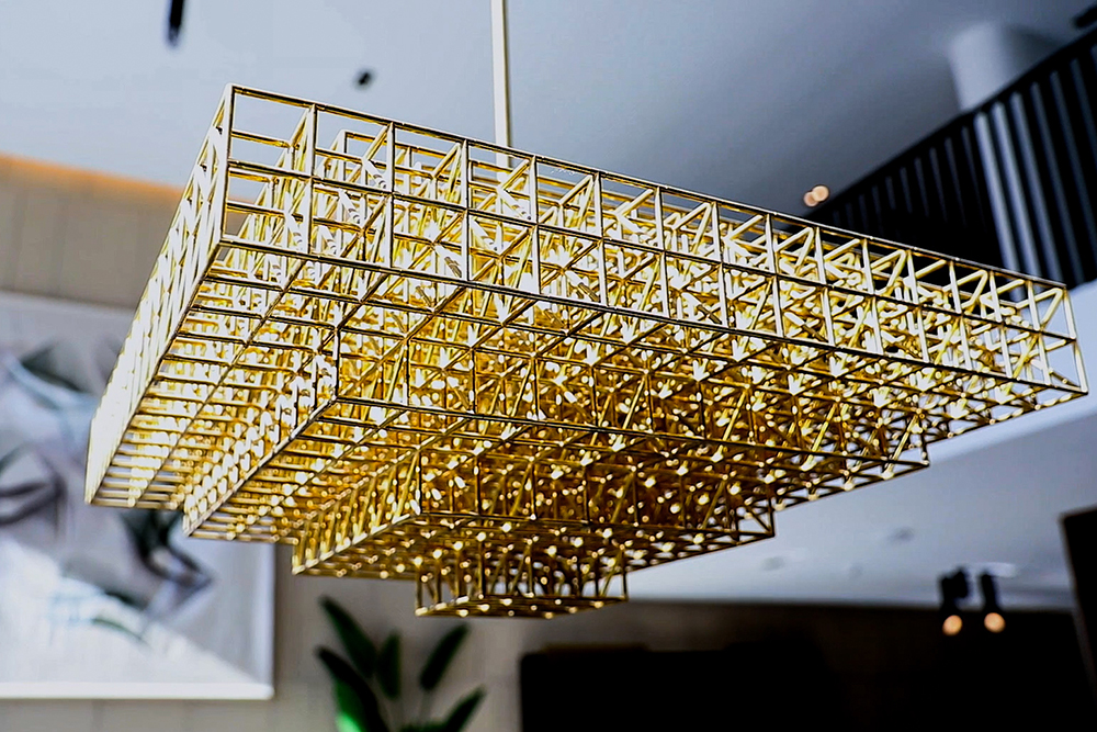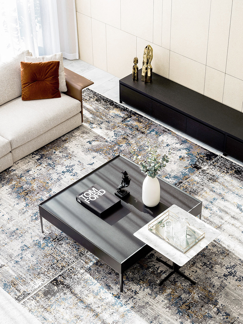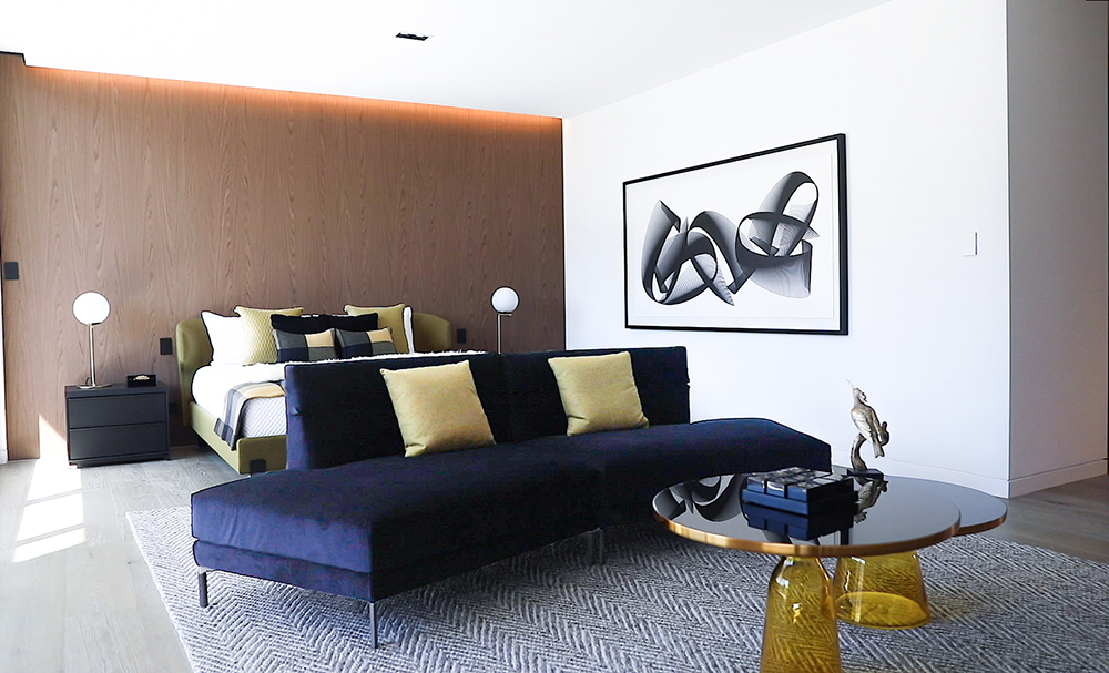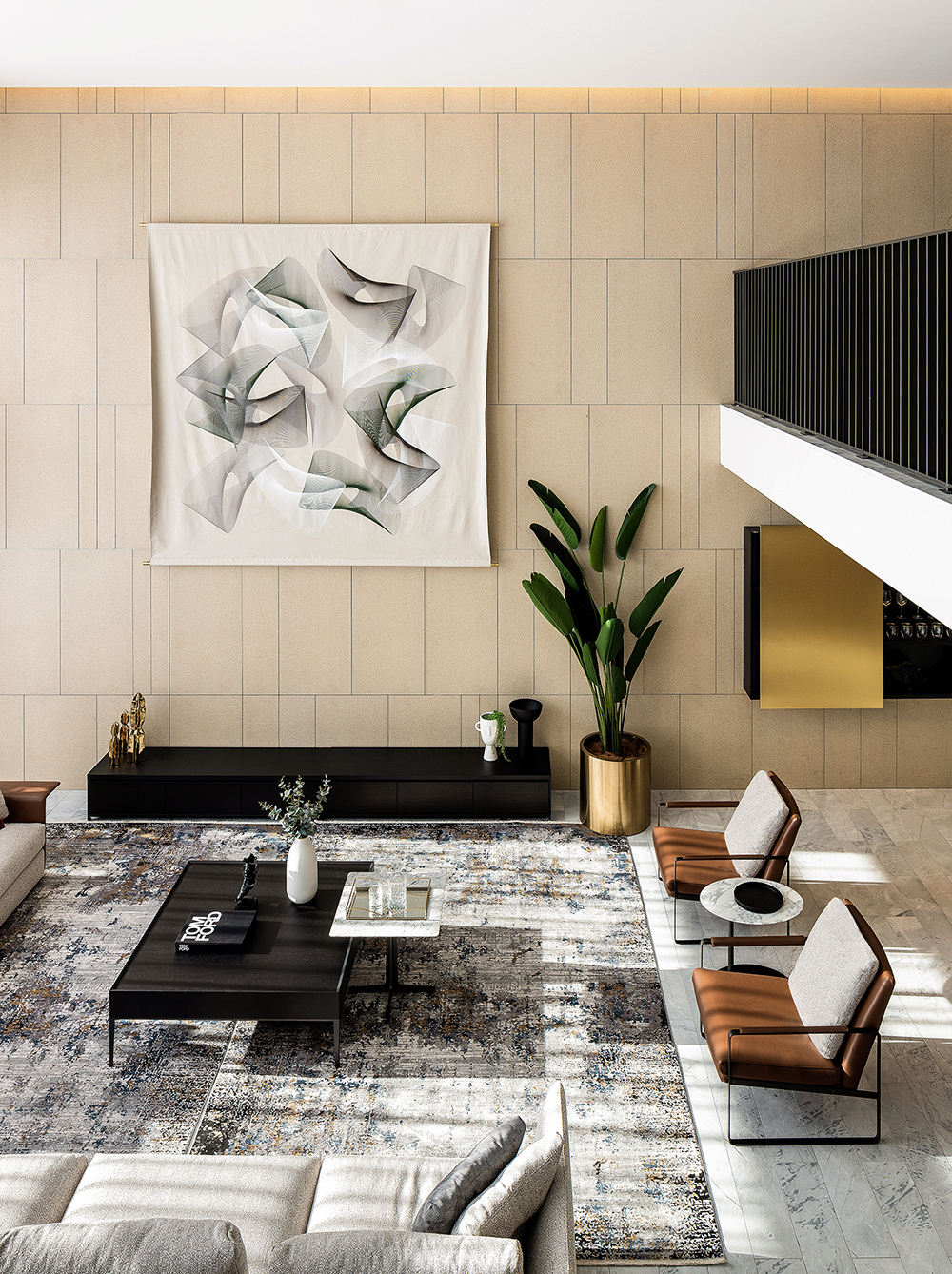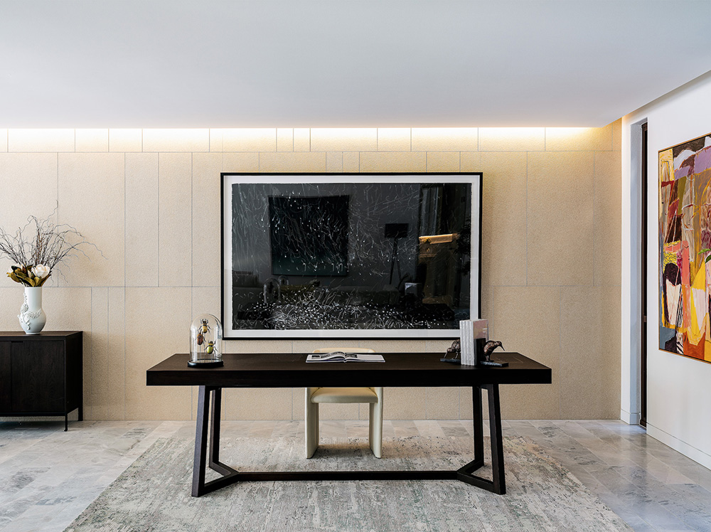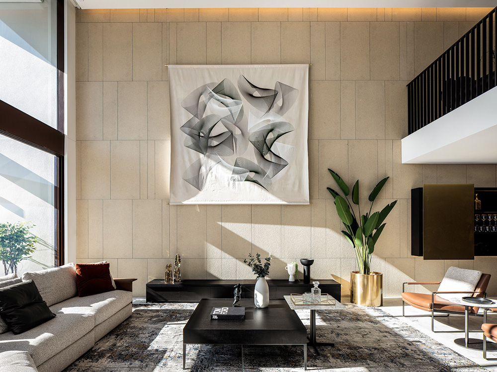 而来自CAMERICH(锐驰)的家具温润大方,平衡了金属材料带来的酷劲,让空间更具舒适性与现代感。客厅中央一组巨大的L形组合沙发与墙面的巨幅抽象画遥相呼应,奠定简洁大气的装饰基调。餐桌上方的黄铜纵横吊灯营造出一种现代工业感氛围。定制切割的ELBA大理石地板传递出高贵优雅的质感。