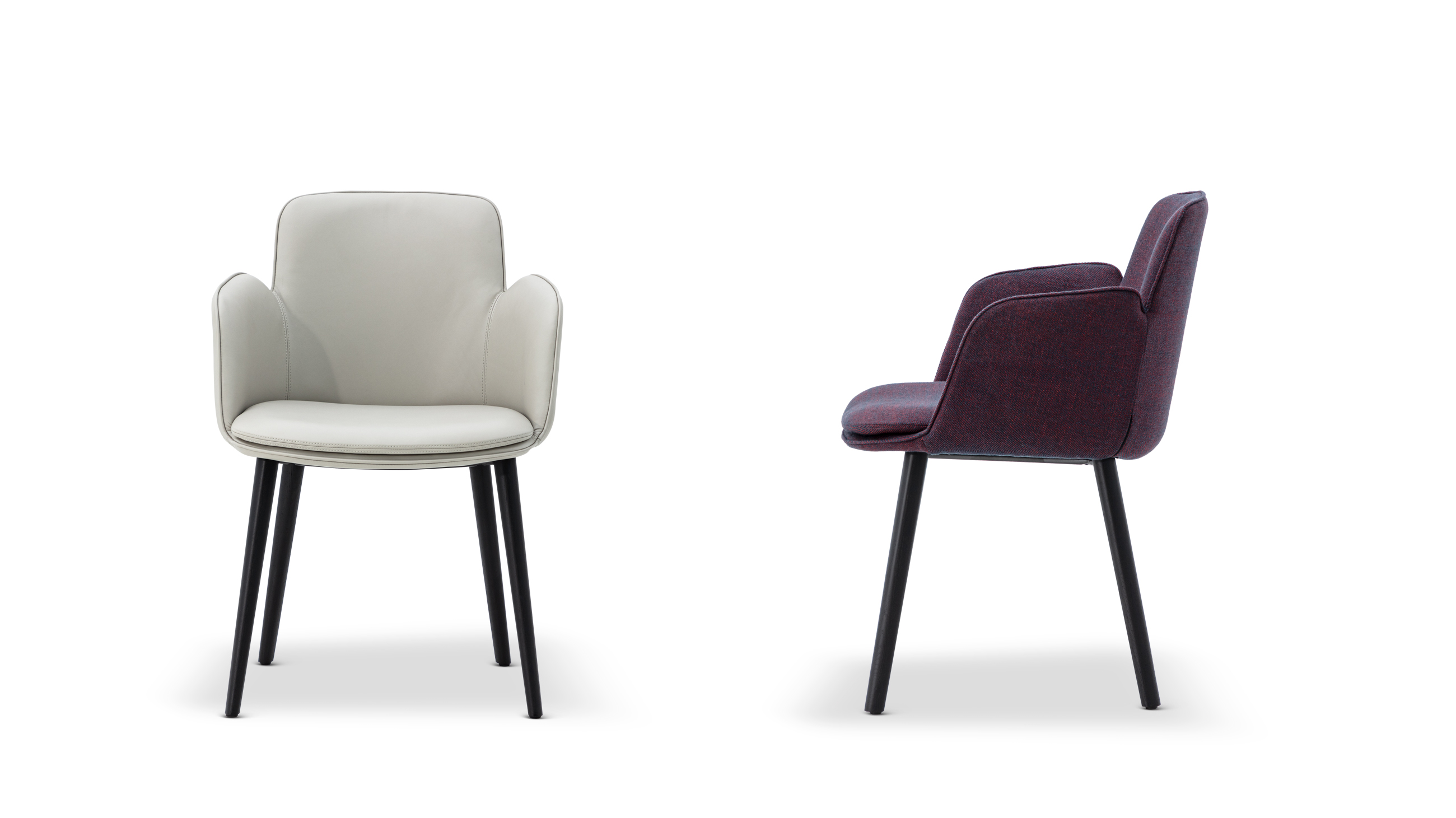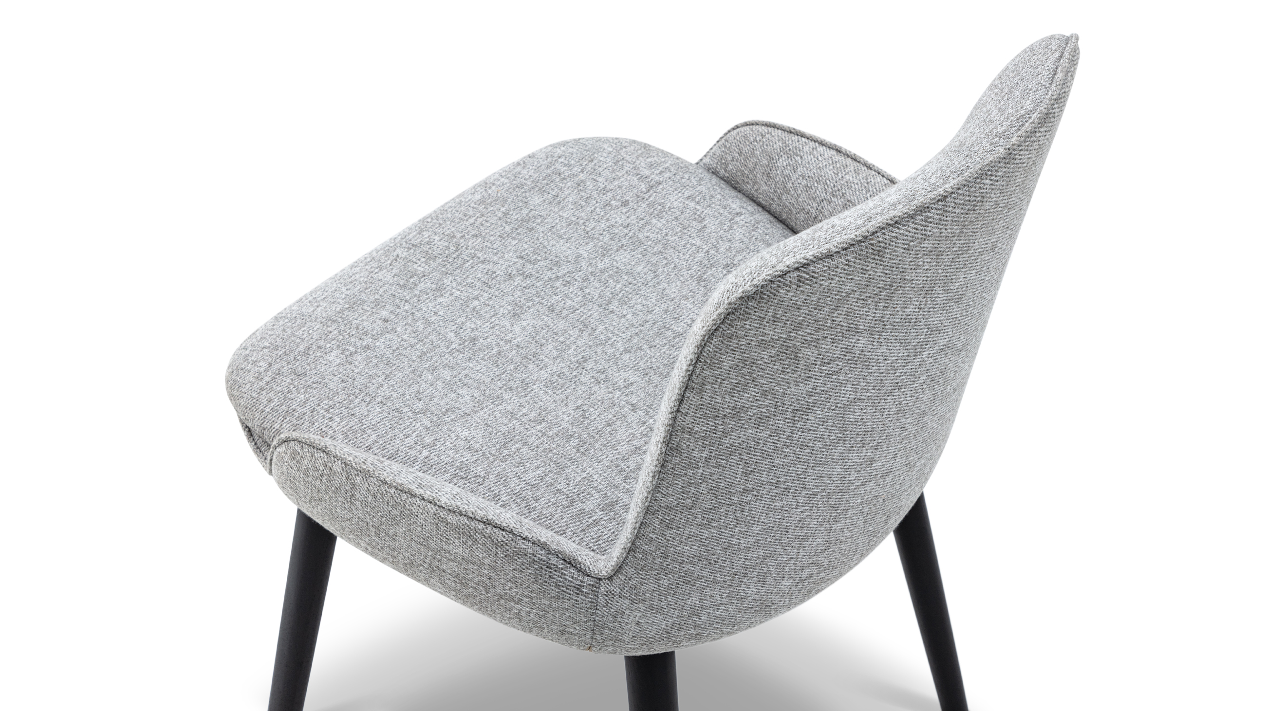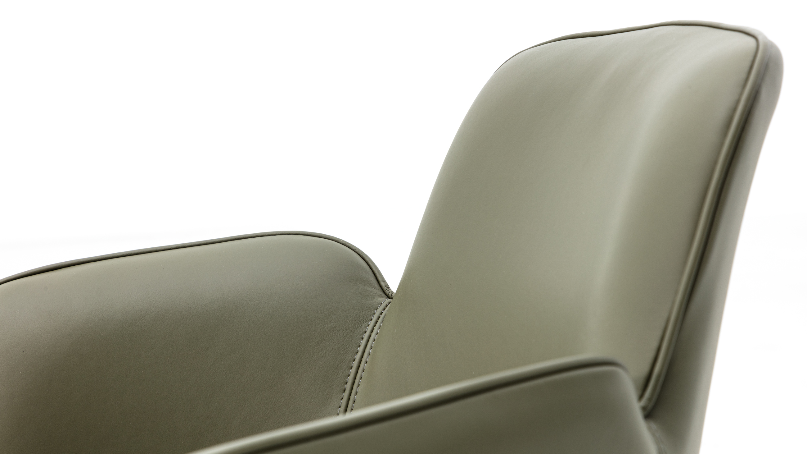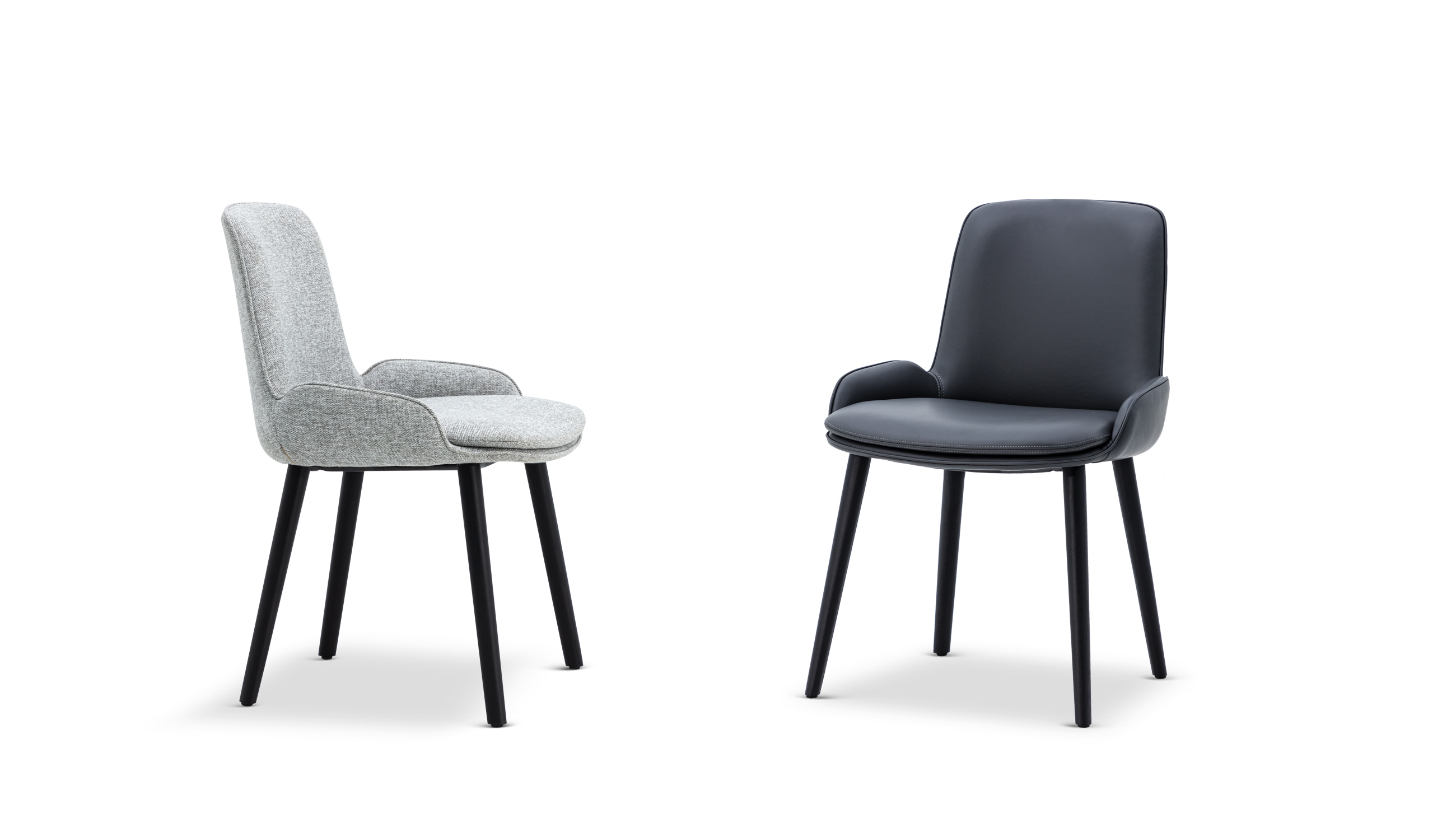 整体形态干练而优雅,兼具美感与辨识度。3D曲面造型椅背,与扶手连贯形成起伏曲线,环抱式承托背部。牙线强调轮廓曲线,勾勒产品质感;类椭圆形实木底腿和金属交叉腿,增加优雅气质。