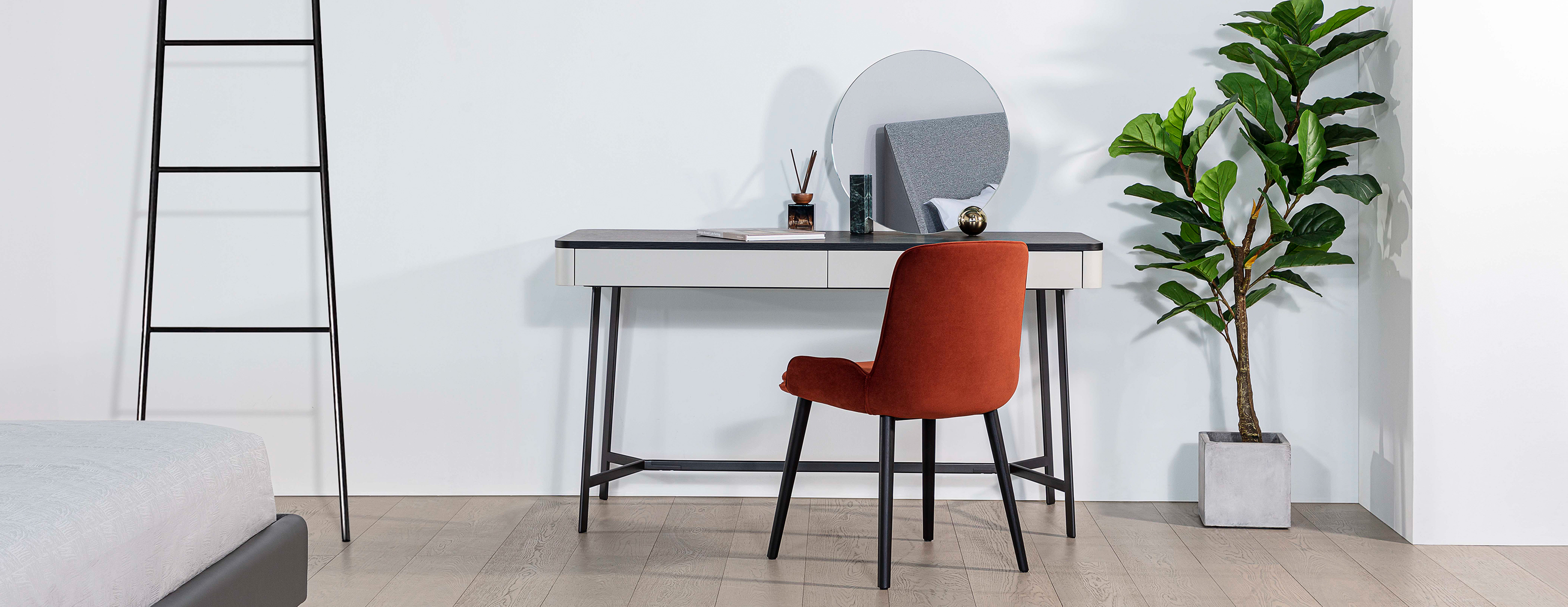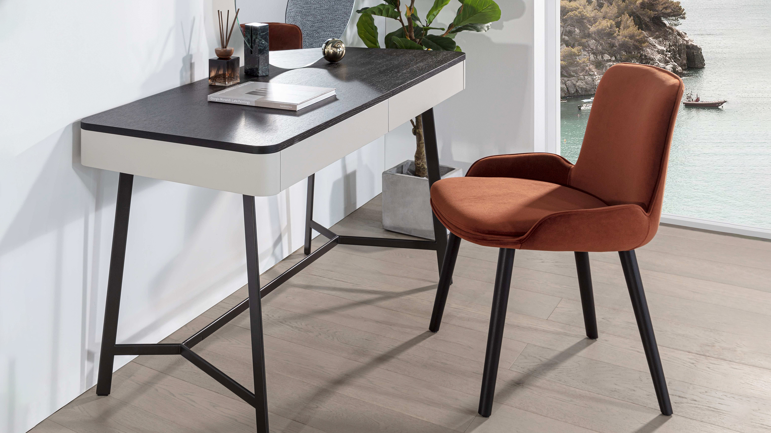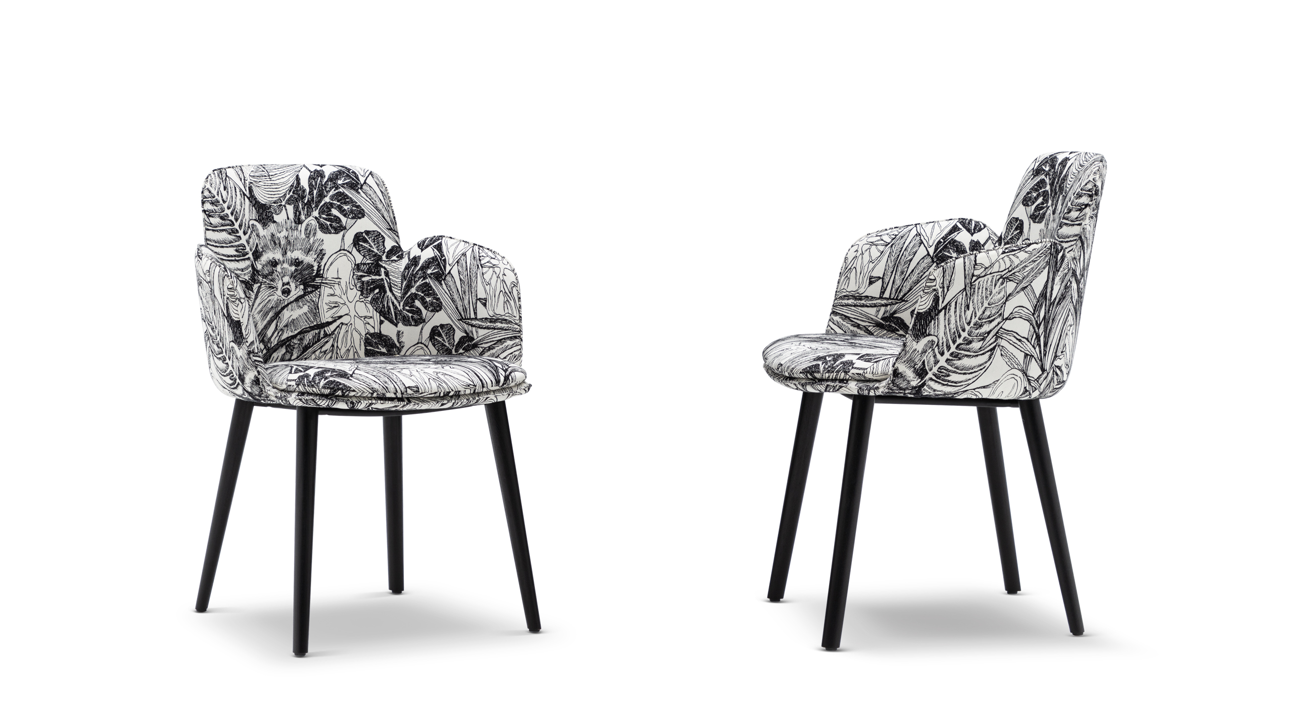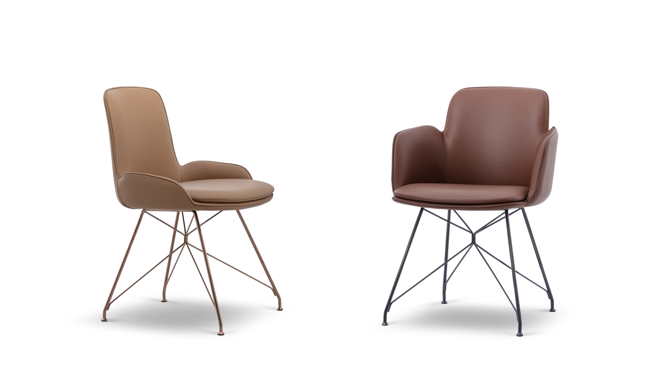 整体形态干练而优雅,兼具美感与辨识度。3D曲面造型椅背,与扶手连贯形成起伏曲线,环抱式承托背部。牙线强调轮廓曲线,勾勒产品质感;类椭圆形实木底腿和金属交叉腿,增加优雅气质。