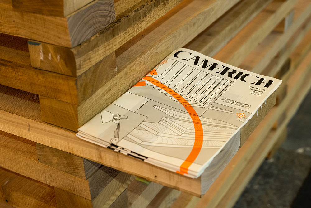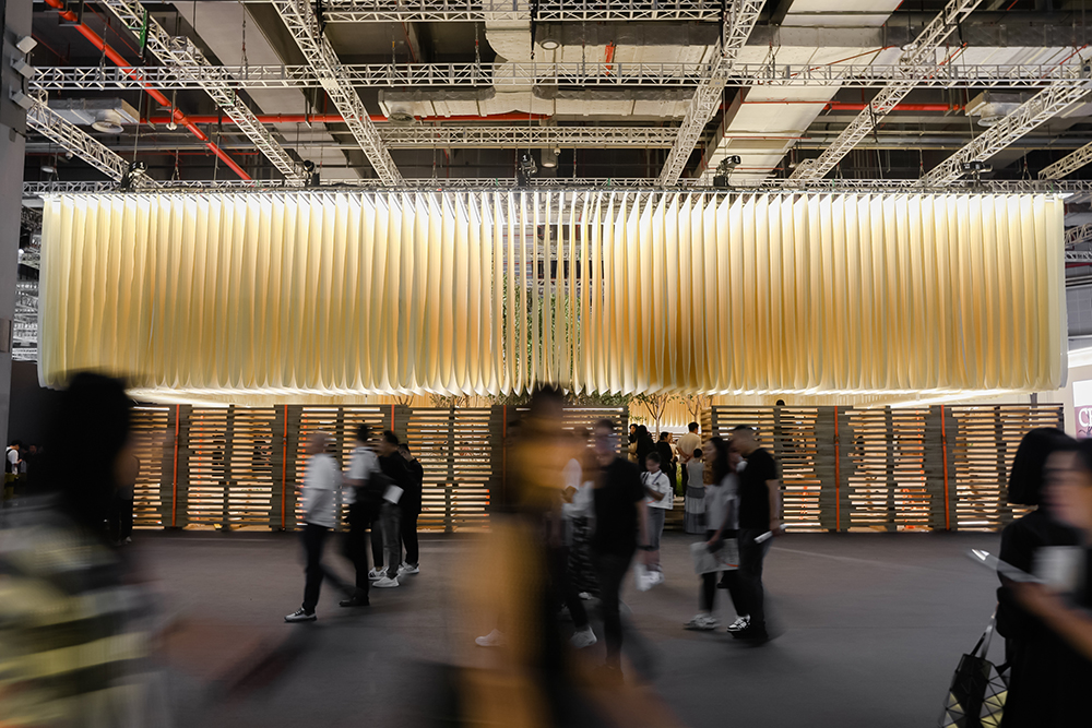 所有布展材料均保持原始和真实状态不被破坏。展区四周的帷幔采用锐驰沙发底布面料,以弯折的方式被悬挂起来,避免裁切造成的浪费。展区周围的木材来自于锐驰的实木产品基材,在展区中交错叠放,并使用捆绑带进行固定,避免使用钉子对基材造成损耗。
