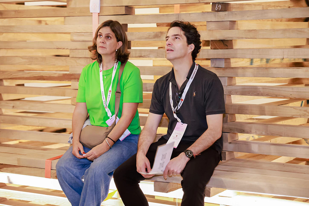 在柔和的光线和安静的氛围中,观展者可以在繁忙中稍作停顿,来到【中转花园】小憩、闲坐或是交谈,并可以领取一份由回收纸张和环保油墨制成的专刊报纸,详细了解锐驰南北园区布局的规划方案,与其中所体现的社会责任和可持续原则。