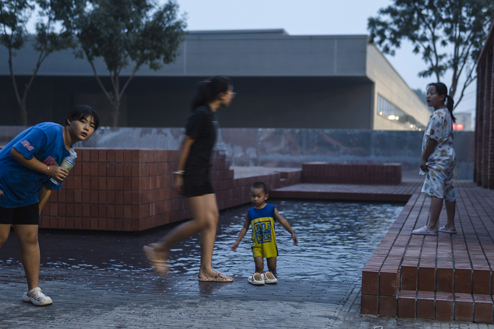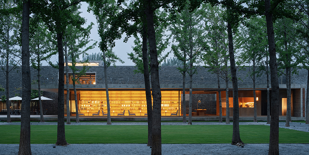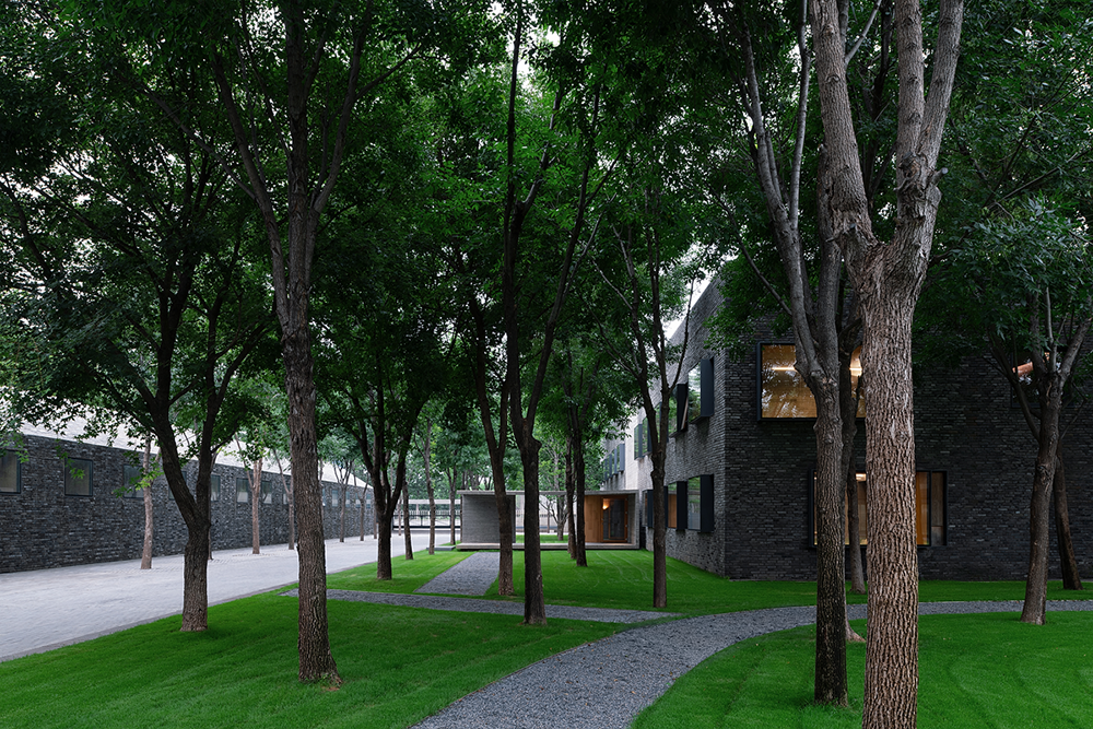 以花园作为展览中心,来源于锐驰北京园区的场地中心是一座花园,员工的工作和生活围绕在花园四周,日常往来于几座建筑之间,都要穿梭经过这里。也如同嘉兴园区坐落在一片自然与田园之中,员工能够通过工厂的落地窗眺望这片运河之滨。