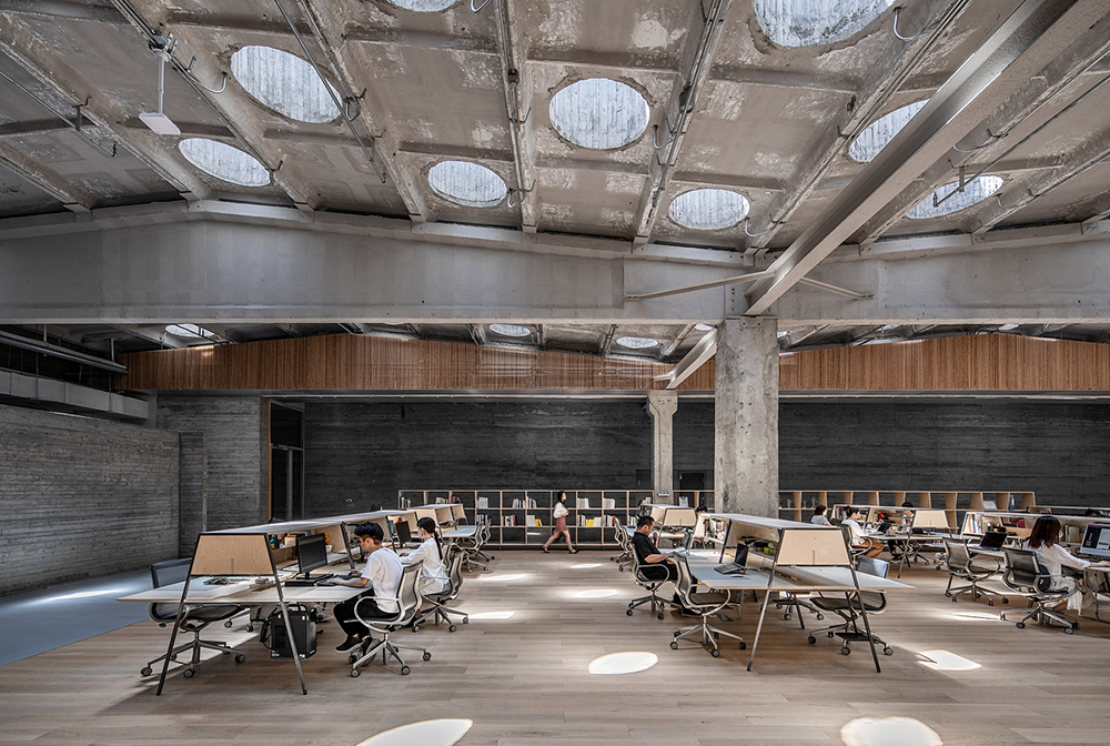 由西涛设计工作室(atelier tao+c)设计改造的餐厅与运动场,同处在一栋老旧厂房之中,改造后空间的内部结构和屋顶温和轻盈的木结构构成了连续的锯齿形屋顶,朝北的天窗给内部空间带来柔和均匀的光线并有效地控制能耗。