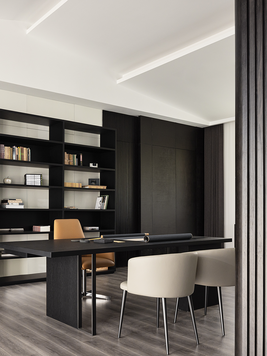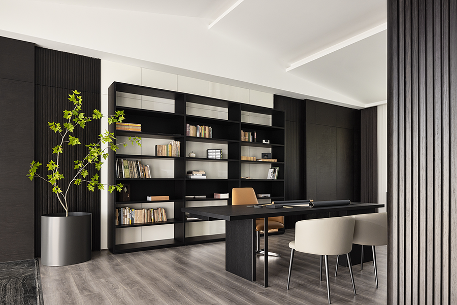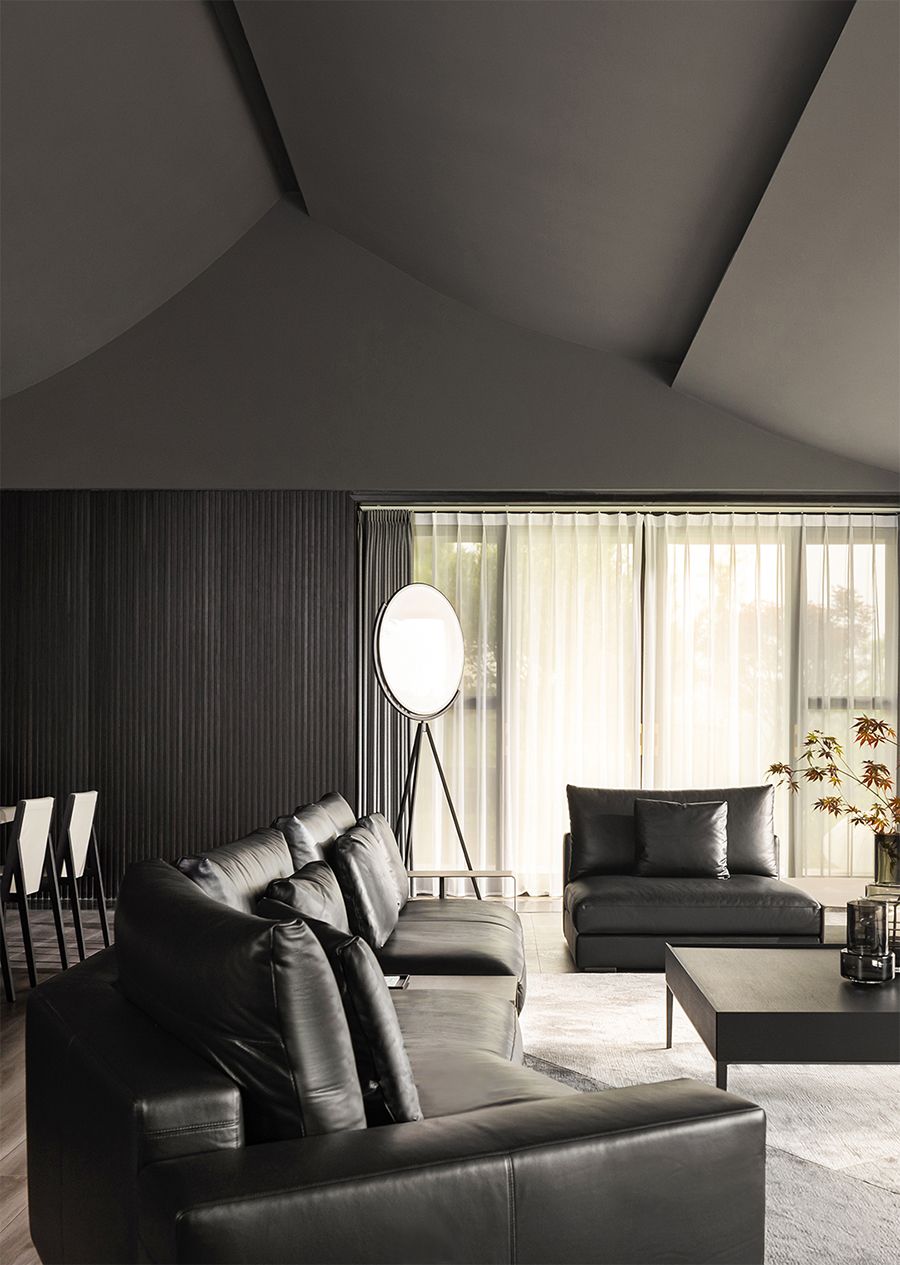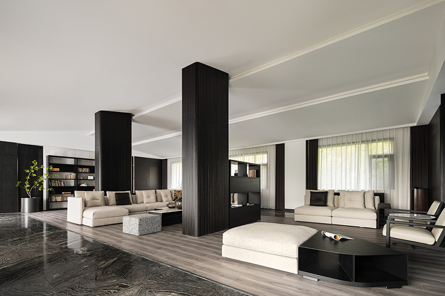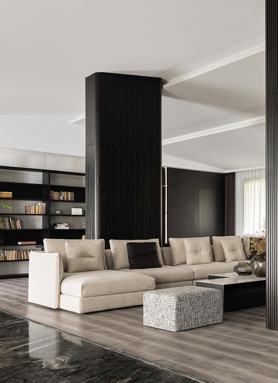 空间线条凝练大气,块面简洁有序,经典黑白色调搭配得相得益彰。白色BLOOM盛心沙发丰富了视觉美感,演绎出安静舒缓的空间节奏。