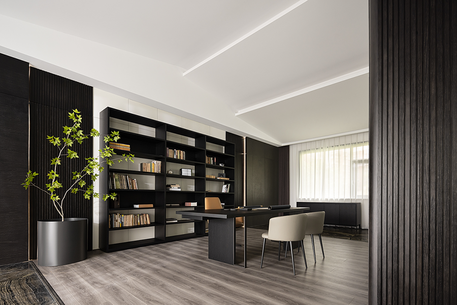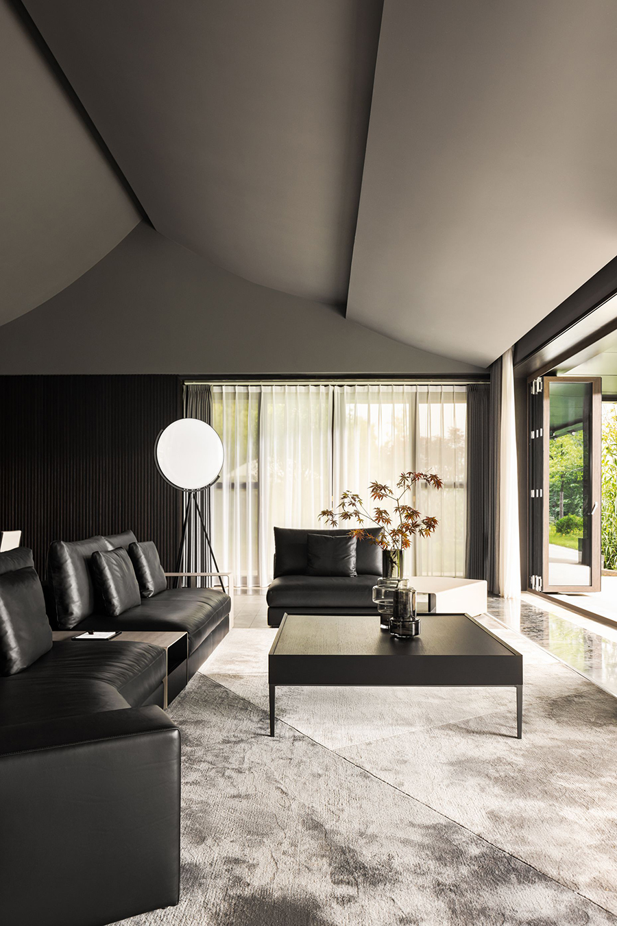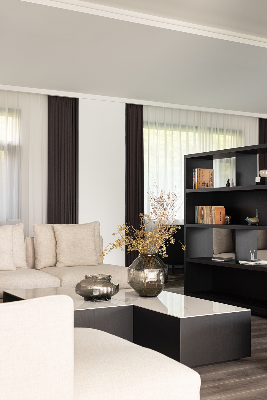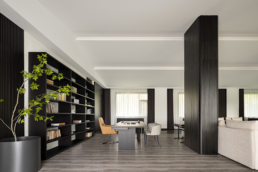 空间线条凝练大气,块面简洁有序,经典黑白色调搭配得相得益彰。白色BLOOM盛心沙发丰富了视觉美感,演绎出安静舒缓的空间节奏。