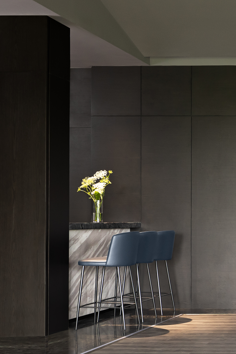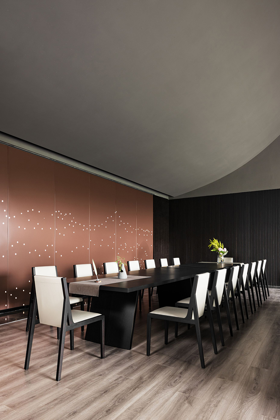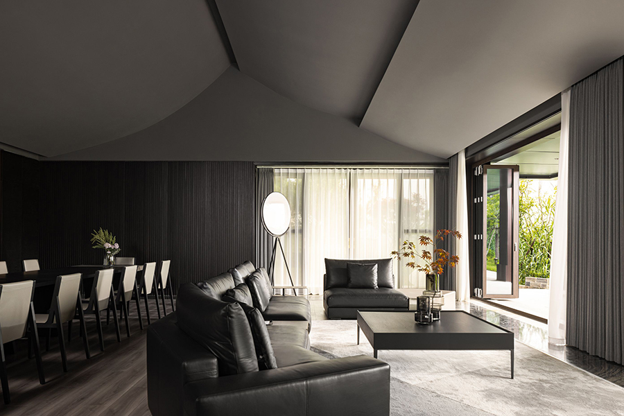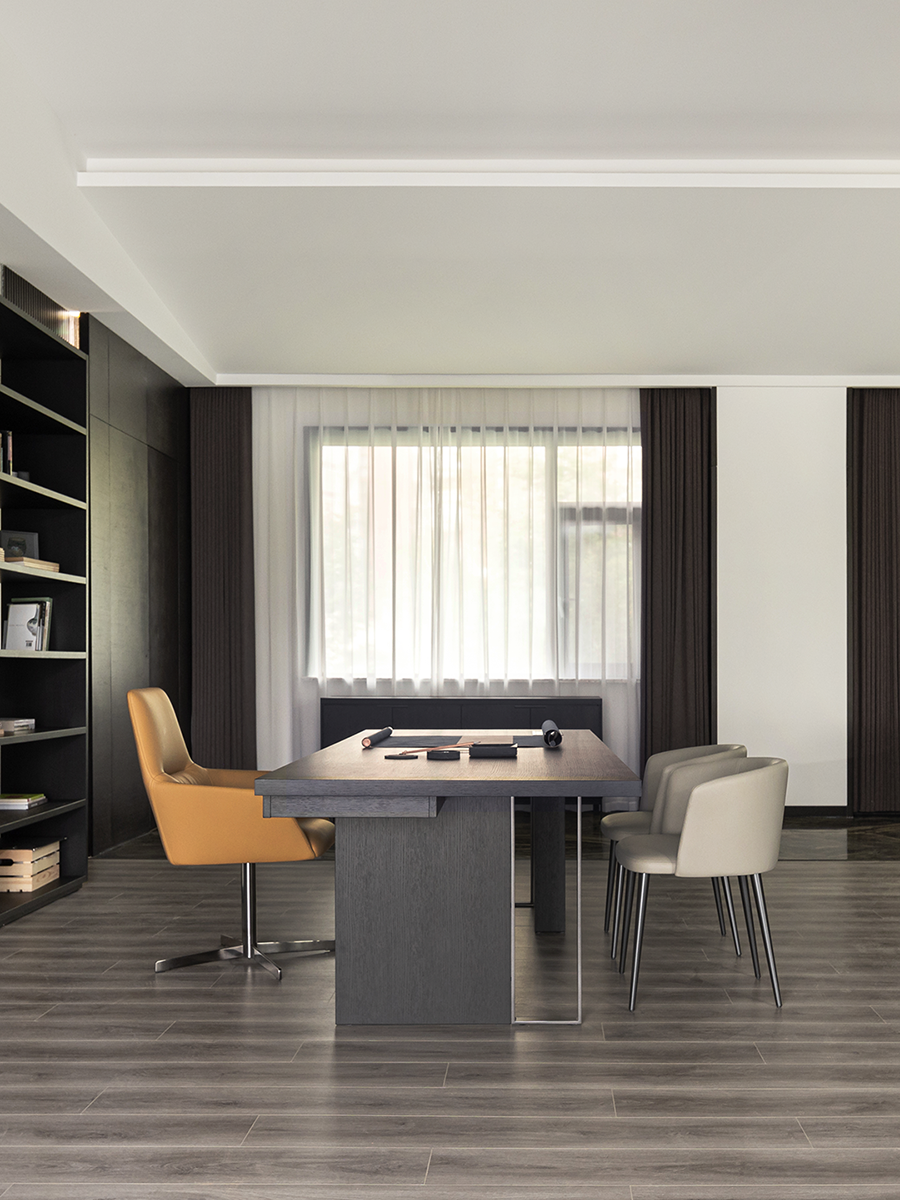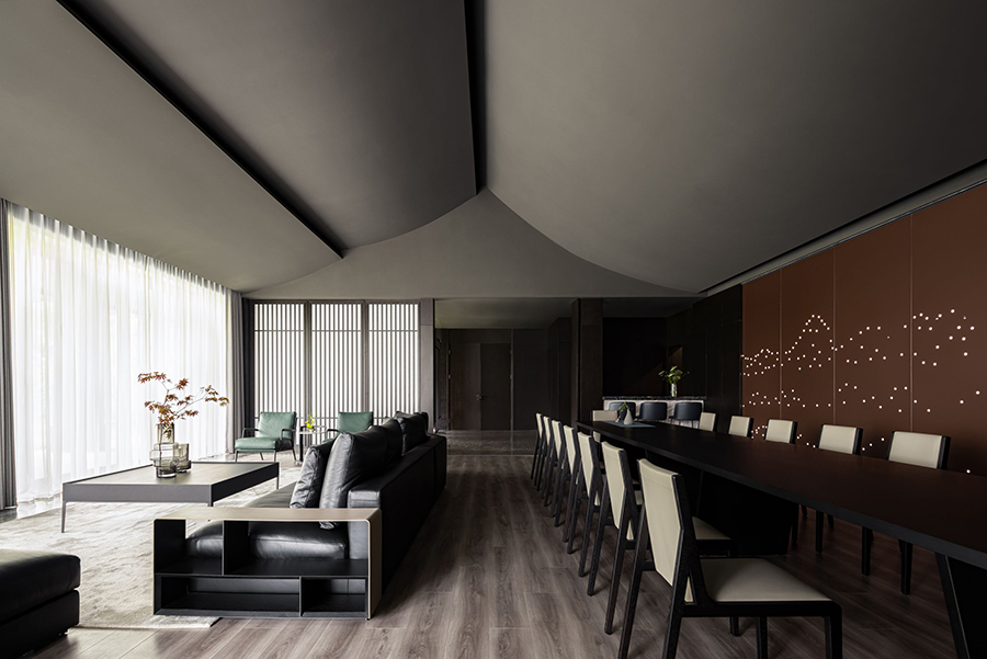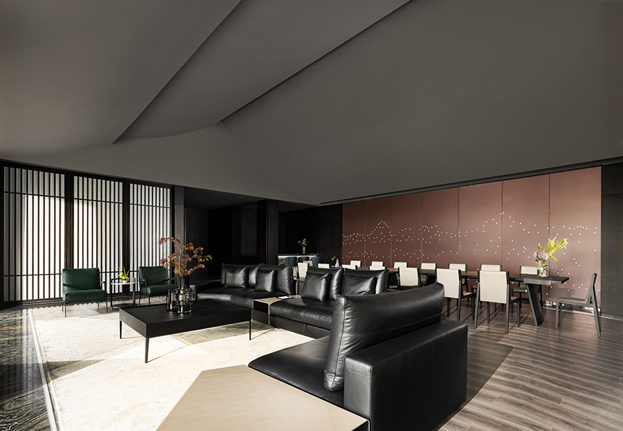 空间一侧为待客区域,黑色皮质EPIC万象沙发奠定了现代时尚、自由惬意的高品质基调。另一侧为用餐区域,FLORA丛椅有序排列,营造出充满仪式感的用餐氛围。棕红色背景墙为点睛之笔,去除了深色系空间带来的压迫感和单调性。