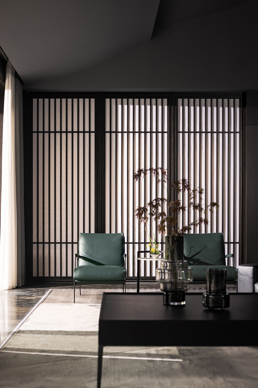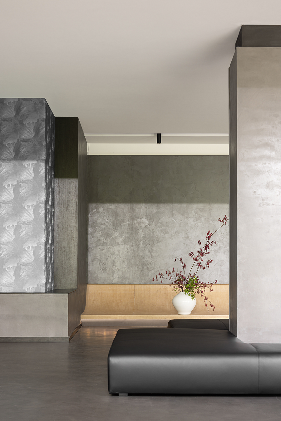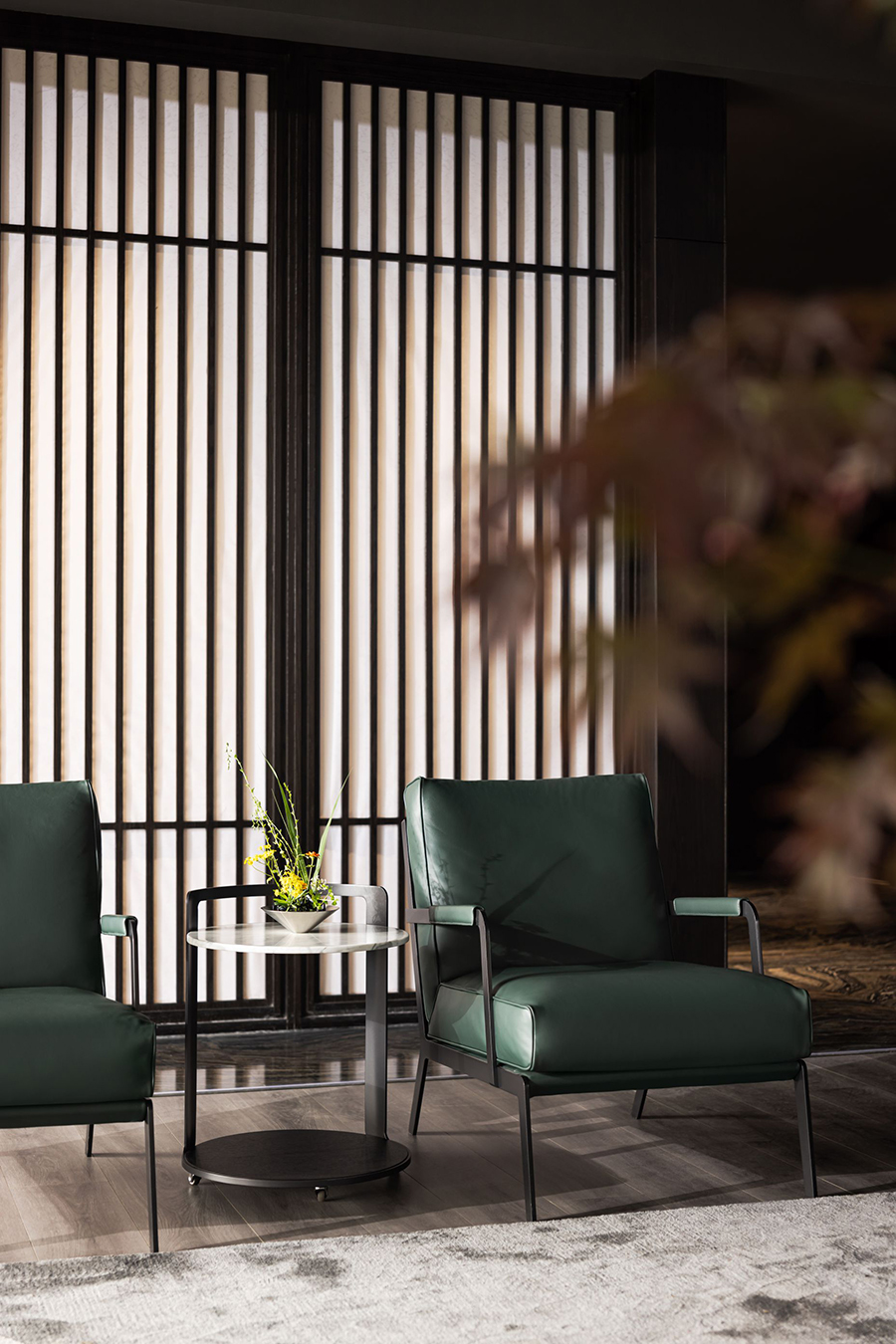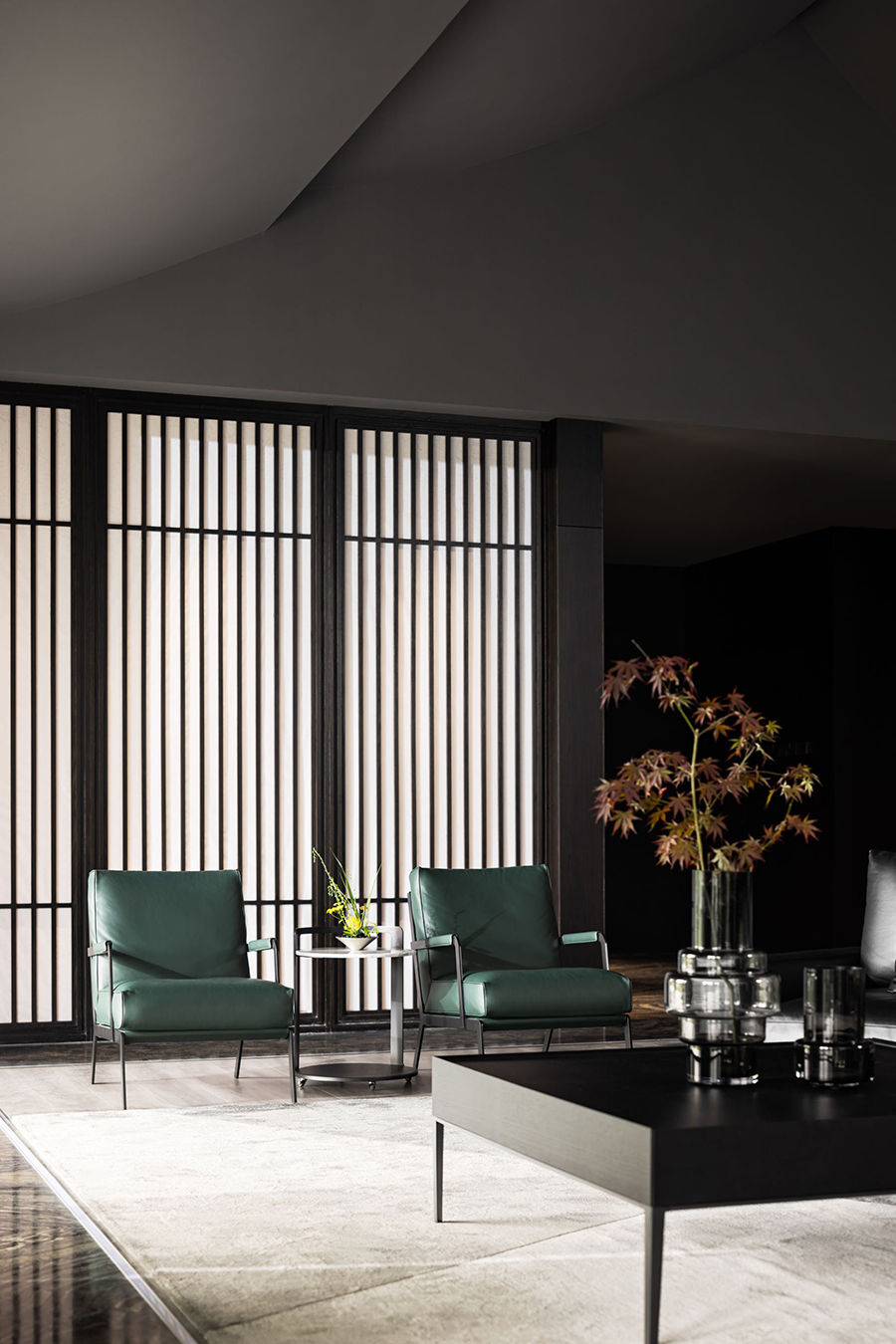 空间一侧为待客区域,黑色皮质EPIC万象沙发奠定了现代时尚、自由惬意的高品质基调。另一侧为用餐区域,FLORA丛椅有序排列,营造出充满仪式感的用餐氛围。棕红色背景墙为点睛之笔,去除了深色系空间带来的压迫感和单调性。