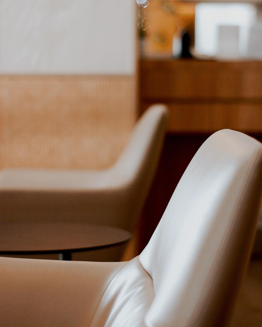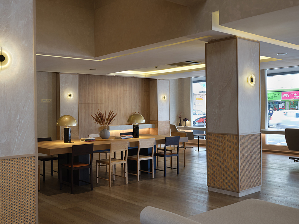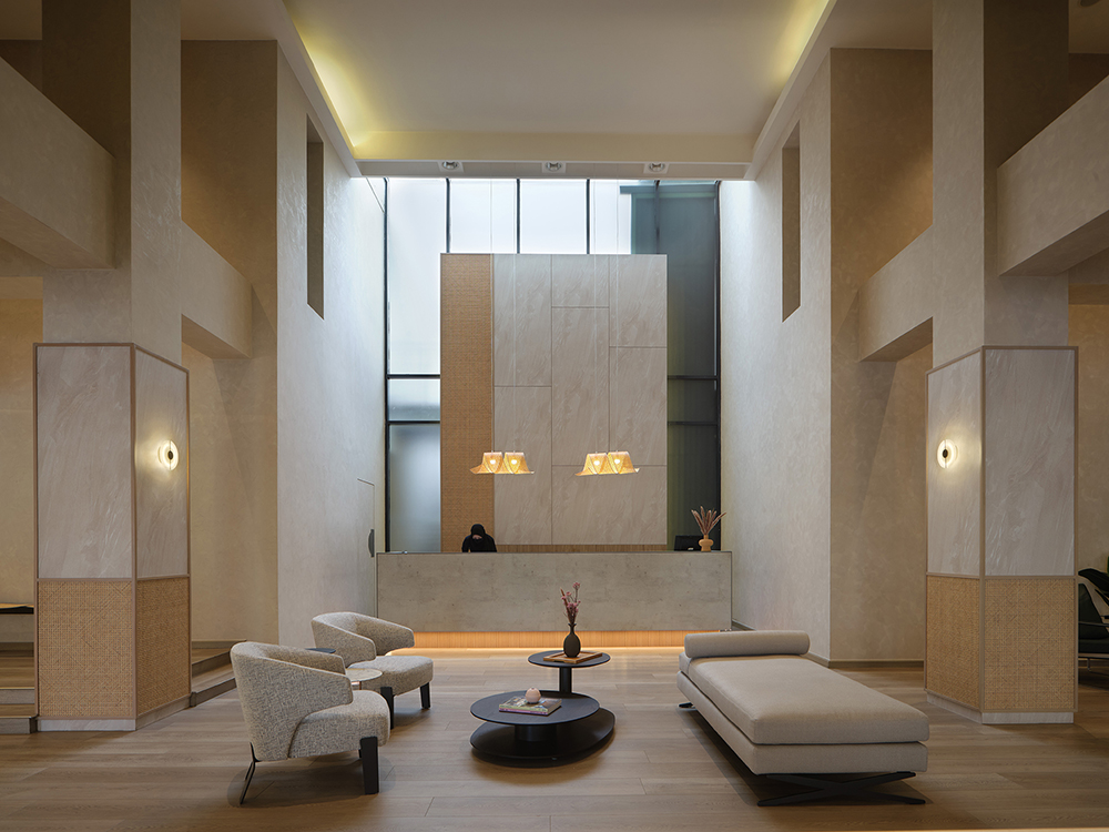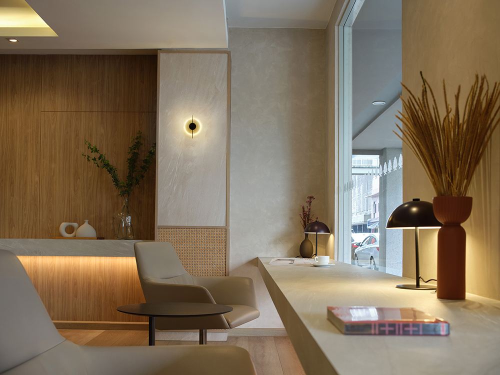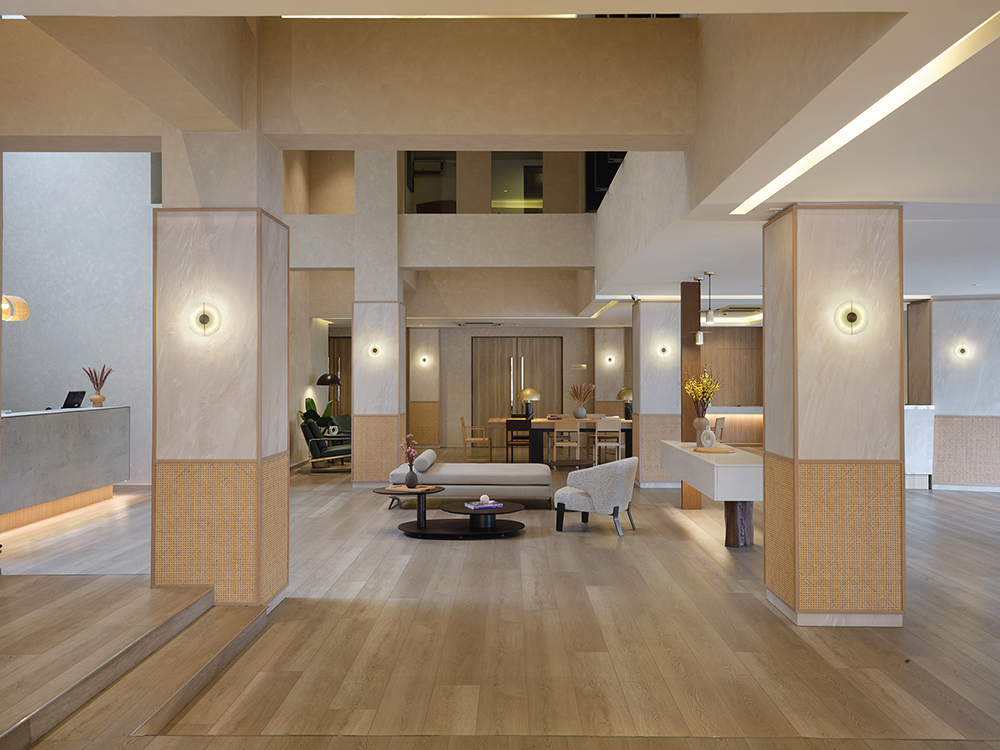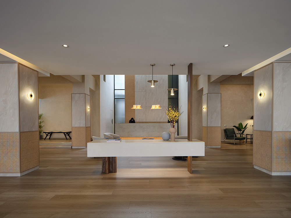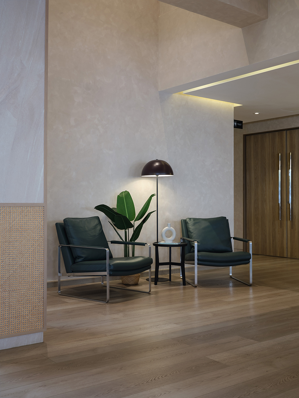 大堂中央双层挑高,接待处背靠落地大窗,在有限空间内营造出开阔通透的视觉效果。方正的立体设计极具建筑美和平衡感,再搭配简洁优雅的CAMERICH锐驰家具,给入住的客人带来一种美好的仪式感。