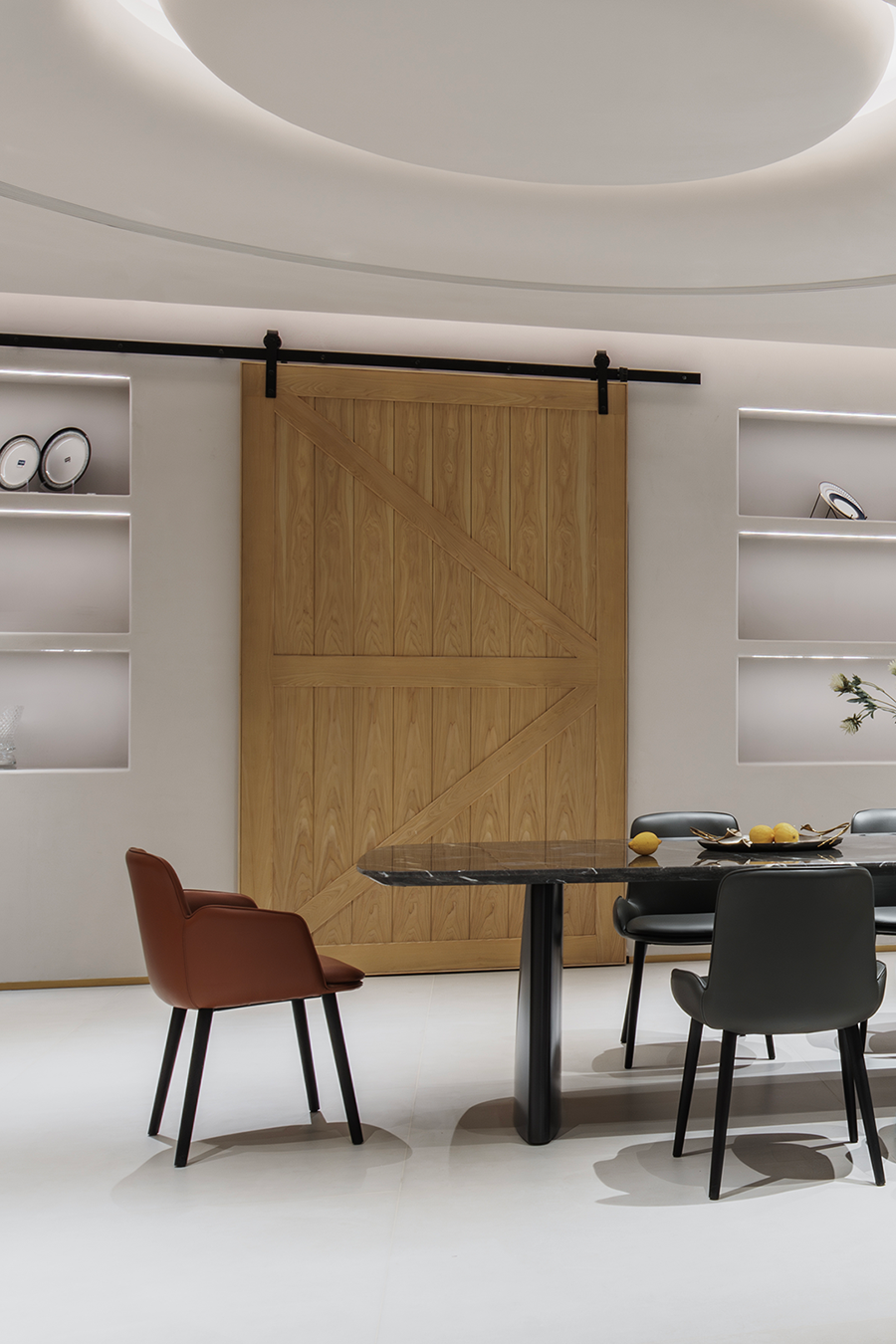 餐厅空间的UNITY家宴餐桌,带出了“阖家团圆”的主题,三五亲朋围桌而坐,共享佳肴美酒。独特几何造型的ECHO围合椅冲淡了用餐仪式的严肃,更加凸出团聚的氛围感。