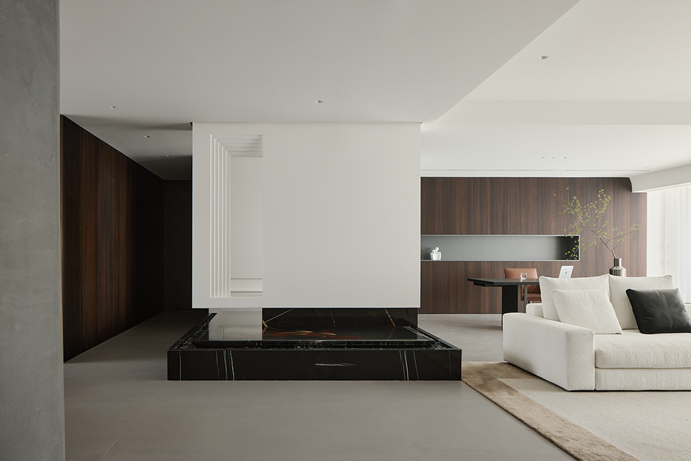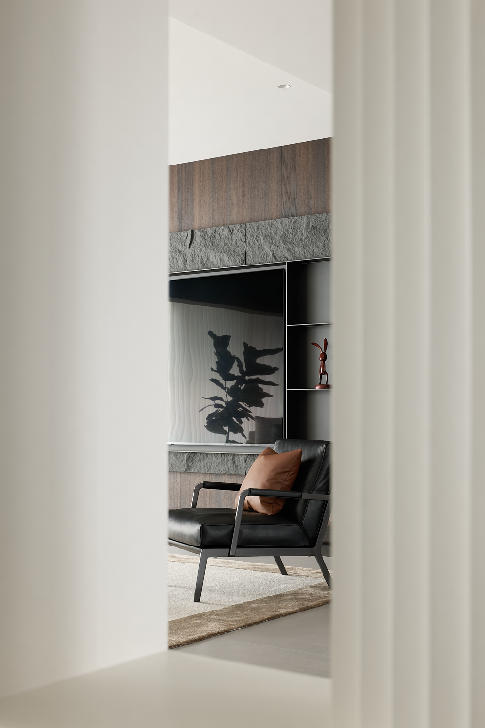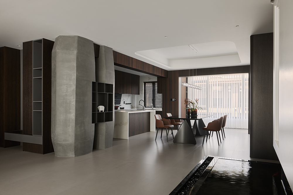 玄关设计独特,灵感源自宋词“盈盈秋水,淡淡春山”。步入玄关,仿佛踏入“秋水之韵“与“春山之态”的一幅立体画卷。水池中,游鱼在光影交织下,轻盈地穿梭,使得“秋水”具象而灵动。水池对面的灰色墙垛,则如同两座“春山”,沉稳而又不失生机,与鱼池中的“秋水”相互呼应,一静一动,构成了一幅和谐的自然画卷。归家后,这片宁静的景象映入眼帘,让人瞬间心神安宁,回归平静。