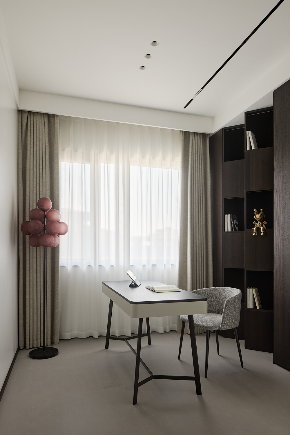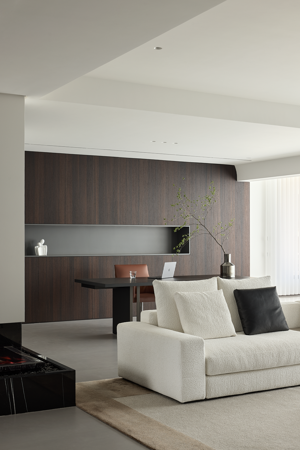 工作区的设计注重功能与美学的结合,直线爽快的TIME时光书桌搭配现代灵动的SOHO书椅,使空间显得井然有序。墙面错落有致,应用斯卡帕叠级的建筑手法,丰富了视觉层次,增加了整个工作区的文化气息。