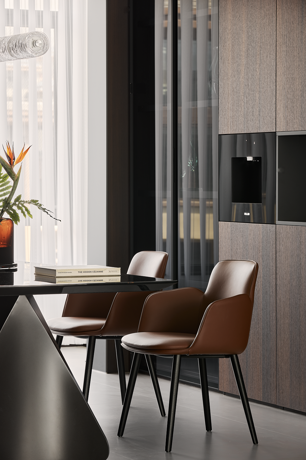 餐厅与客厅相连,采用开放式设计,使整个空间更加开阔。SPIN旋桌与WING翼椅的设计优雅干练,为用餐带来现代雅致的氛围。木质纹理增加了空间的温暖感,绿植的点缀为餐厅增添了一抹生机。