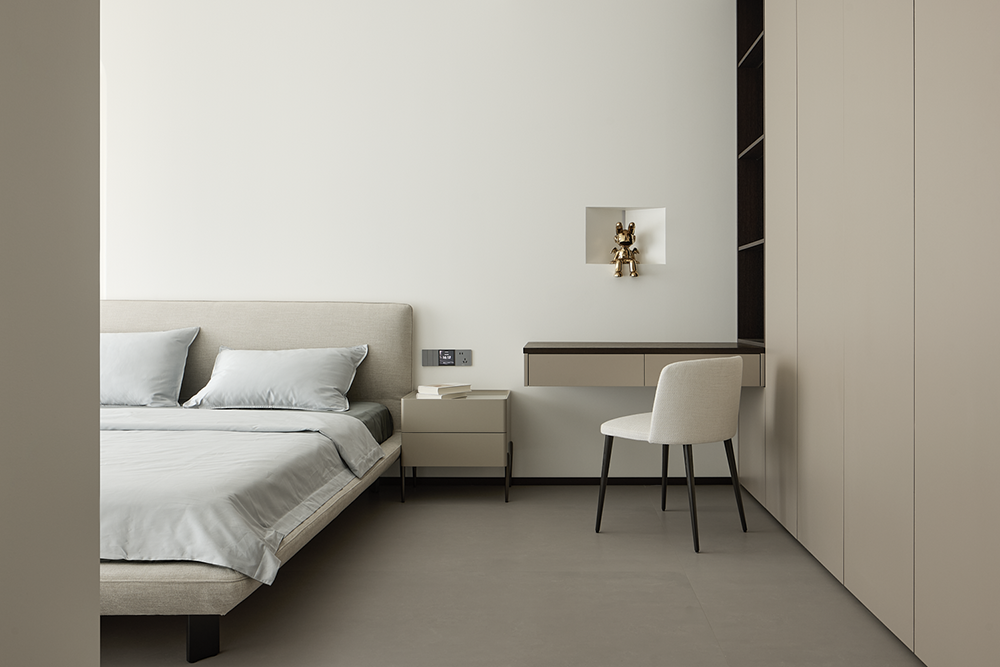 另一间男孩房采用简约的家具与柔和的色调,床头的弧形壁饰增加了空间的趣味性。多功能储物柜,能够满足日常收纳需求。整体的设计搭配为孩子创造出一个充满想象力与探索欲的成长空间。
