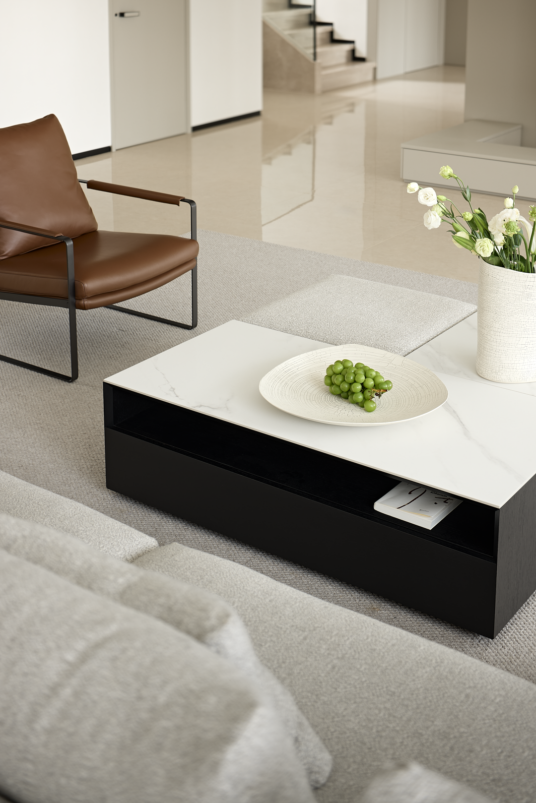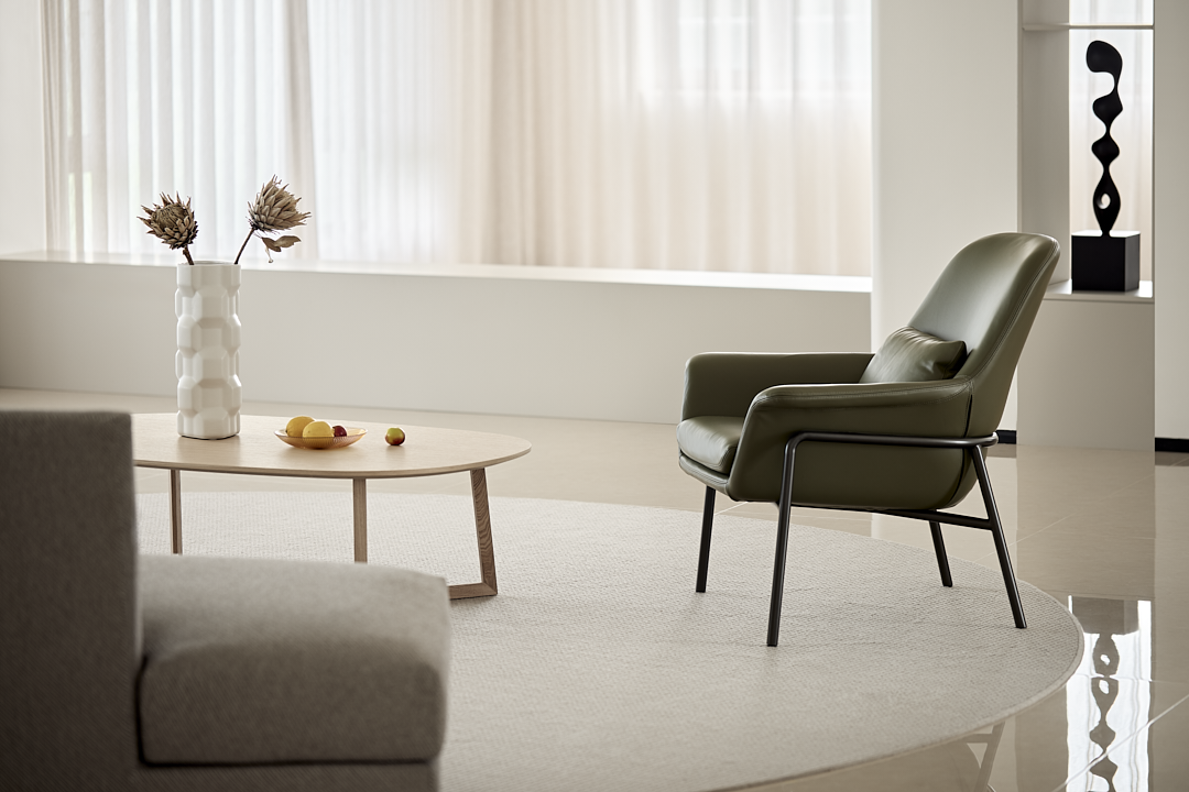 AMOR彼岸沙发以其独特的造型成为整个空间的亮点。沙发的弧形设计不仅为空间增添了柔和的线条感,还巧妙地围合出一个亲密的交谈区域。