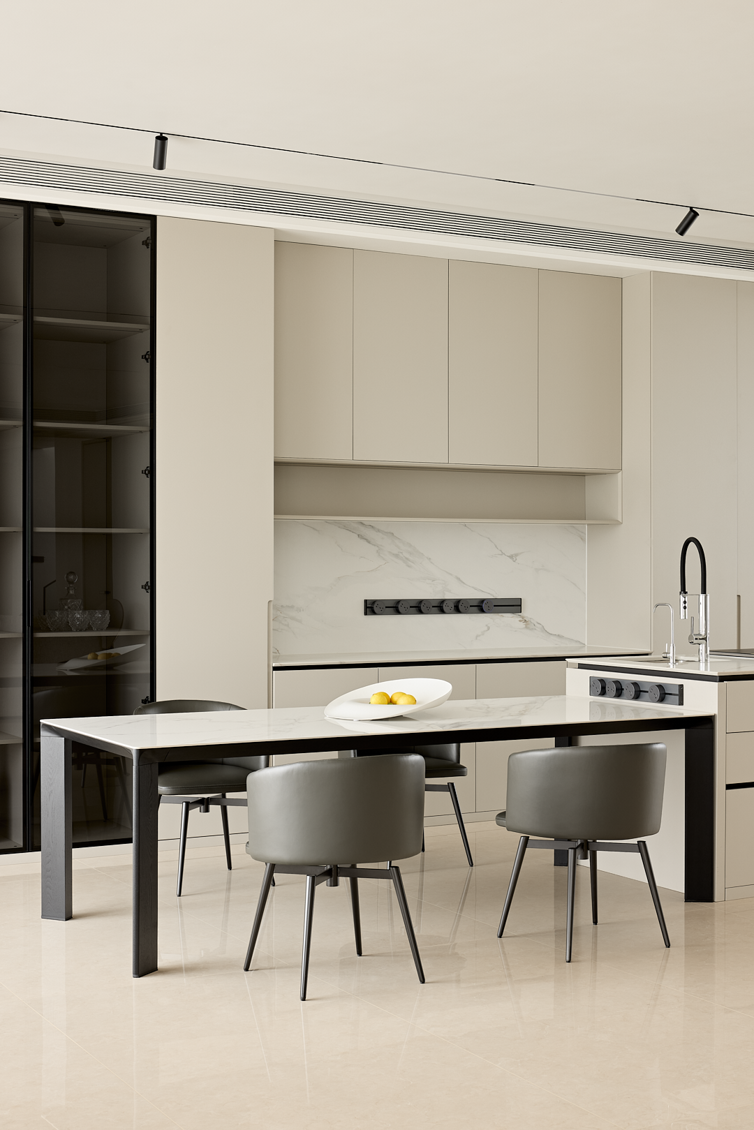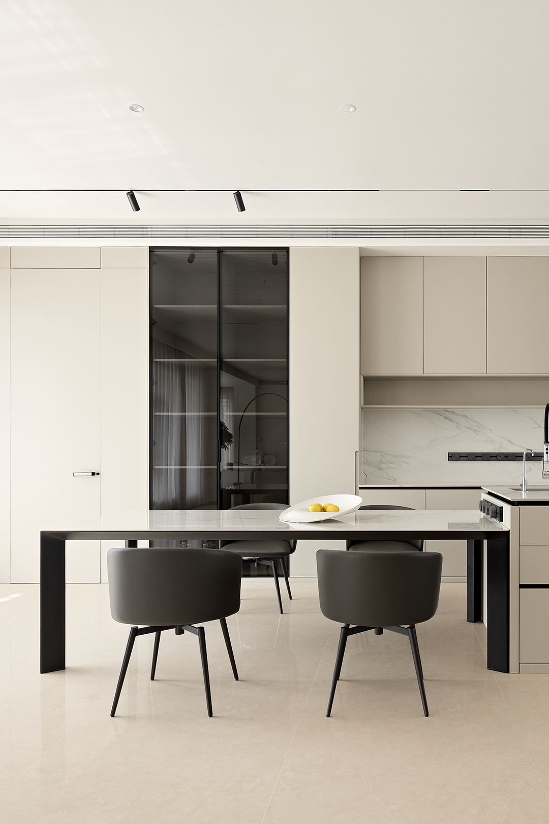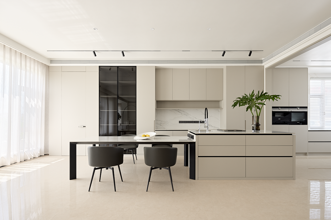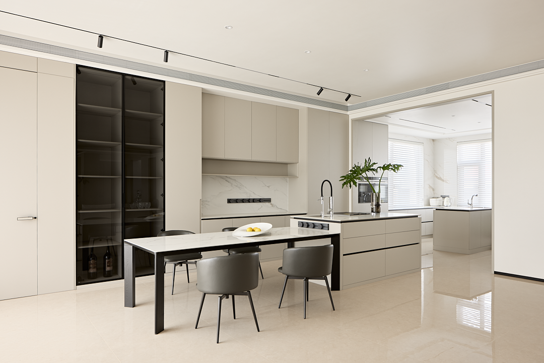 合理的餐厨动线,让日常的烹饪与用餐过程变得更加便捷,同时又不失美学享受。隐蔽式多功能储物柜设计,隐藏了生活的琐碎,让空间始终保持整洁有序。
