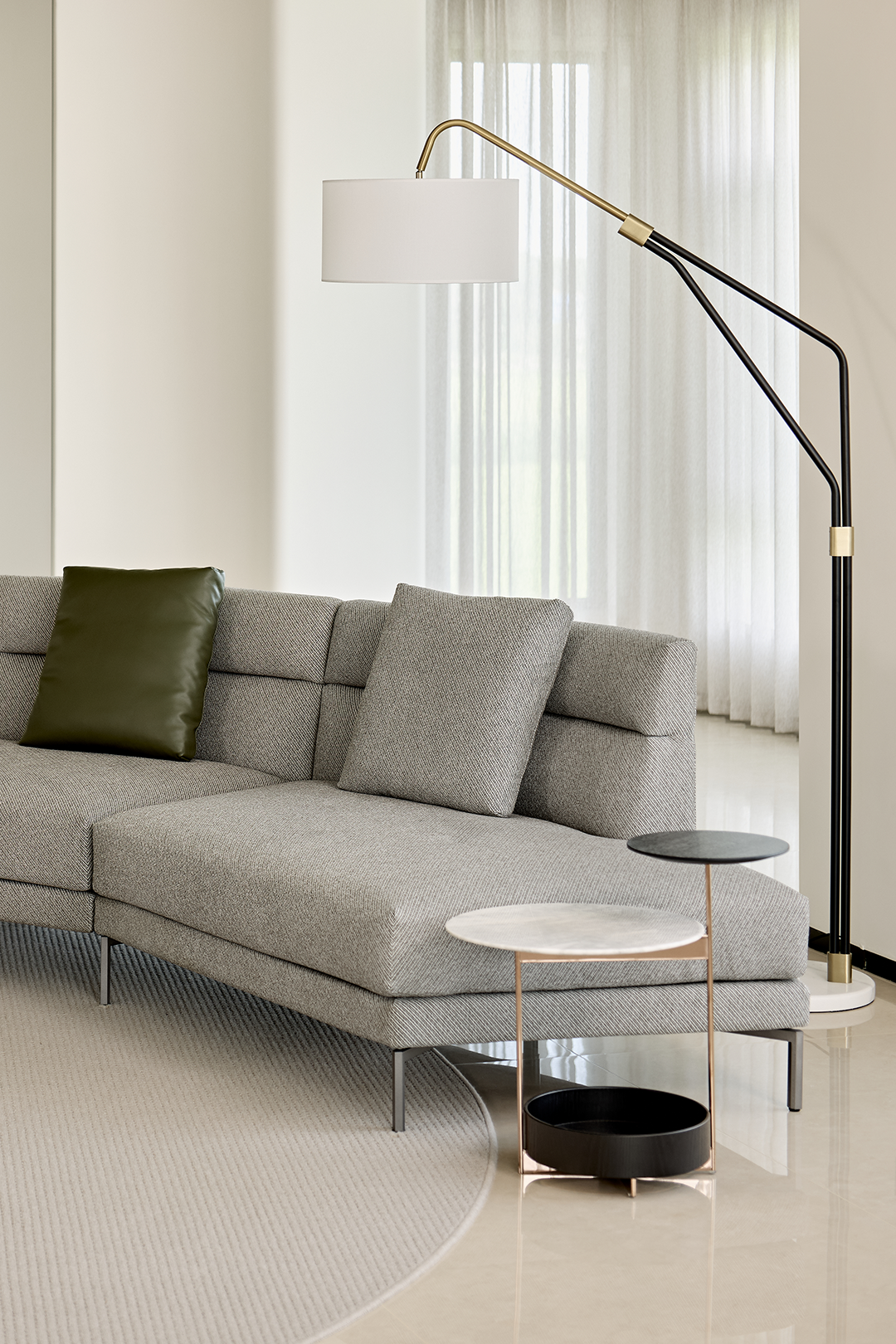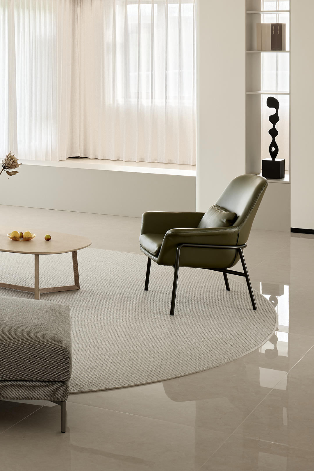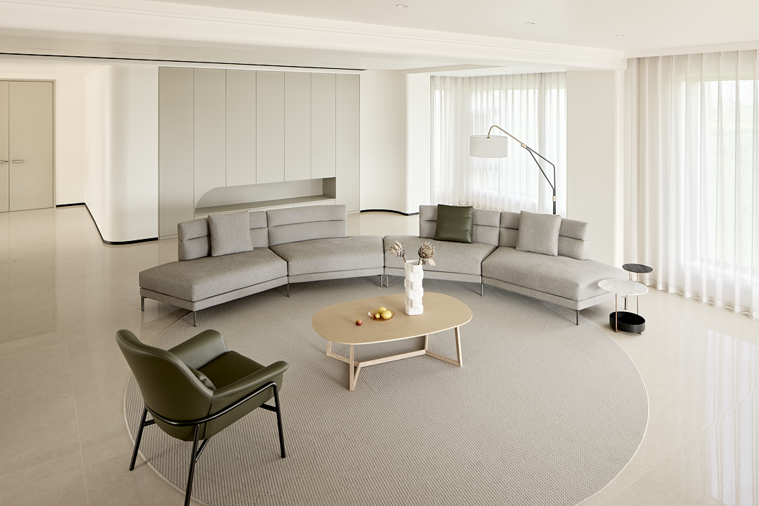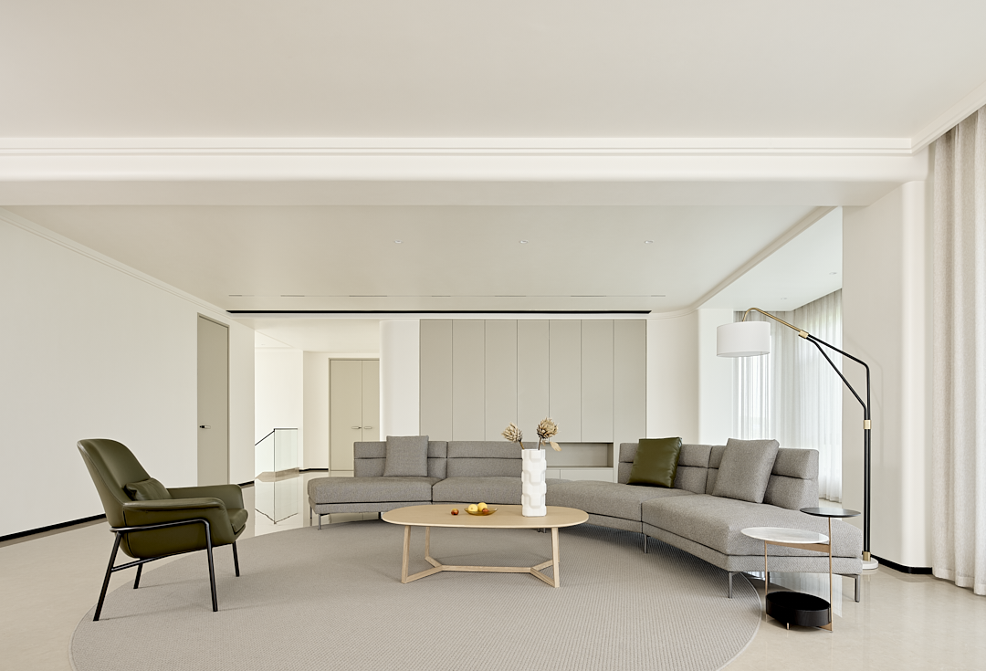 圆形地毯与弧形沙发相呼应,不仅起到装饰作用,还在视觉上为客厅空间增添了一份融洽和谐的氛围。