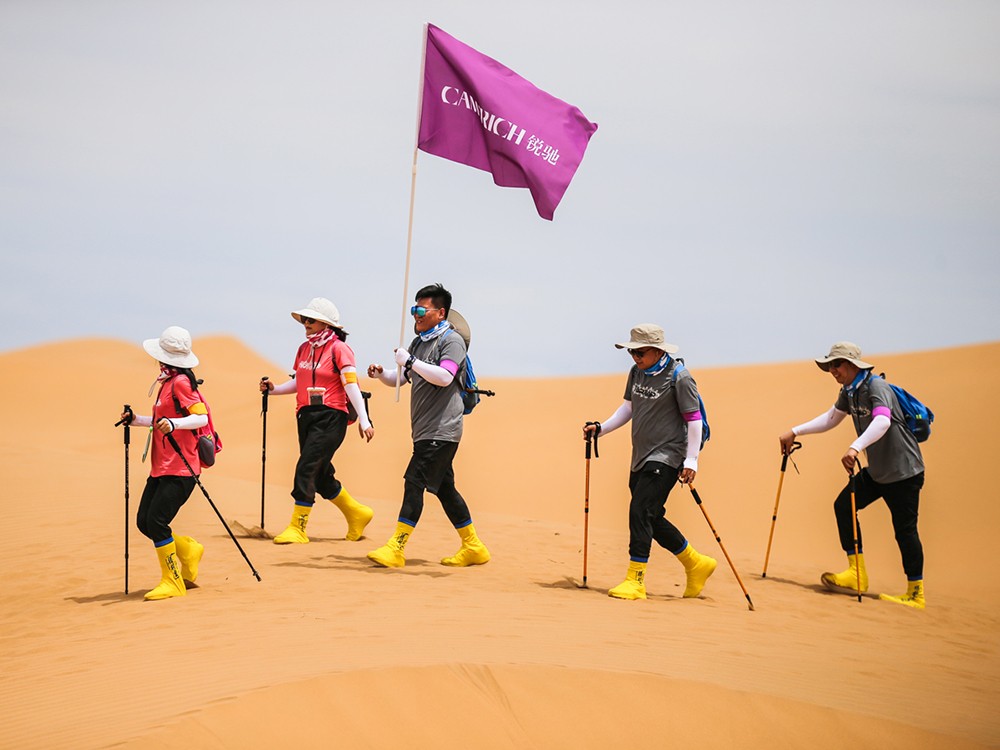 顶着炎炎烈日,国内著名家具品牌CAMERICH锐驰近百名员工远离城市的喧嚣,用前行的脚步丈量腾格里沙漠的辽阔,以及内心的坚韧。十五公里的徒步挑战,对于拥有各种代步工具的都市人来说,颇有几分难度。一路上,他们虽然倍受酷暑折腾,也经历着内心抉择的痛苦煎熬,甚至忍受着体力近乎透支的折磨,但却彼此相互关怀,心向终点聚集,以超越自我的勇气将“穿越一次,挚友一生”的精神完美诠释。